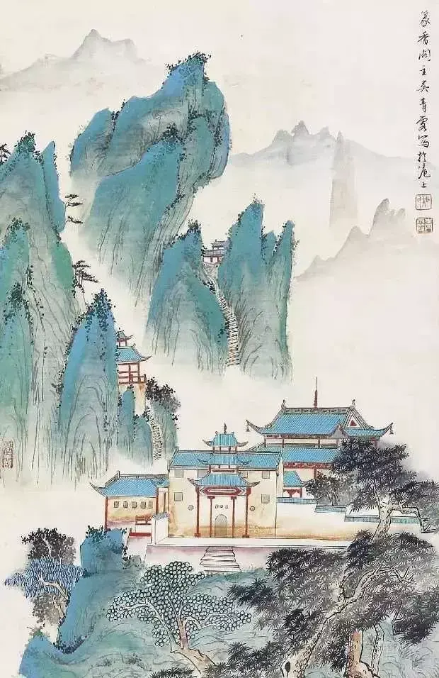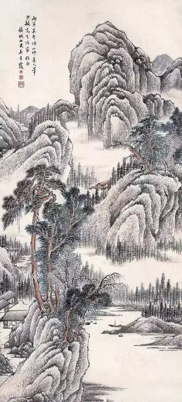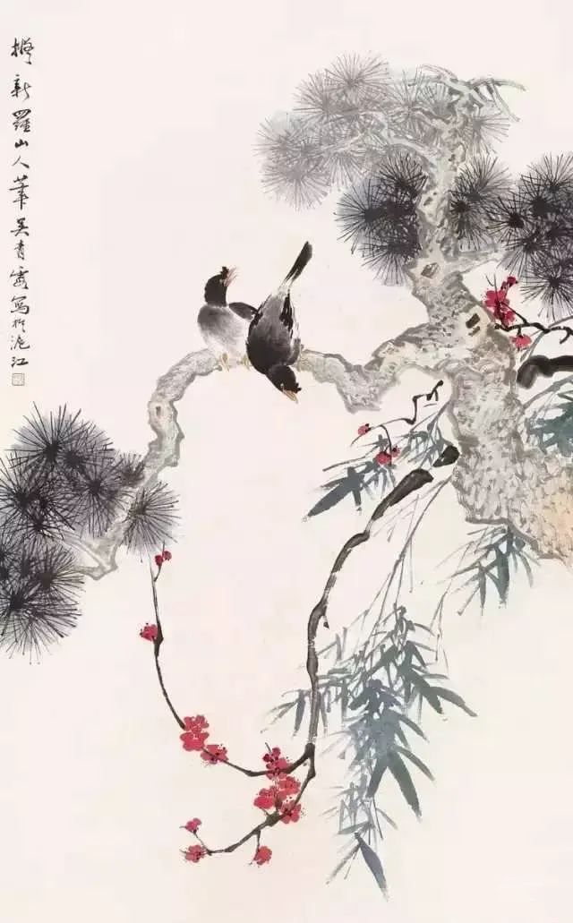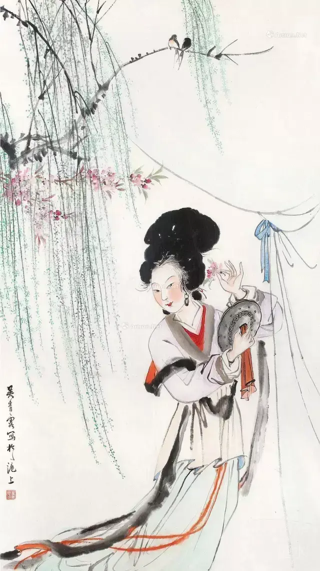 吴青霞的花卉小品,也画得情趣盎然,线条流畅,墨韵相生,色彩明洁秀丽。所绘侍女,衣带飘飘,眉目传情,颇见李公麟,唐伯虎,仇十洲之遗韵。她山水画创作极见传统功底,即呈南北二宗之象,又有元明风骨,儒雅清健,笔墨多宗唐寅,文征明。画山水,她强调师古人,更要师造化。她曾六上黄山,晚年仍不顾年迈,不辞辛苦,肩负画夹到全国各地名山大川写生作画,以达外法心源之境。