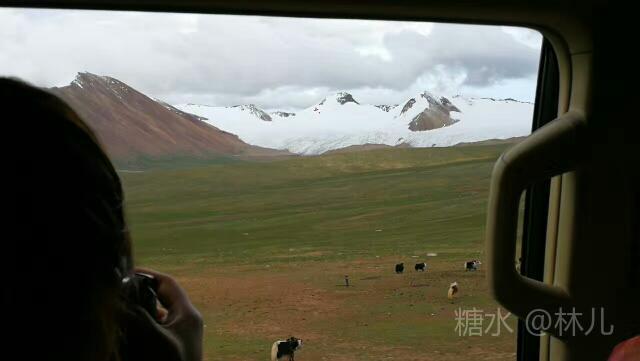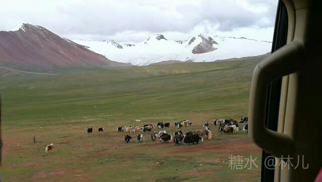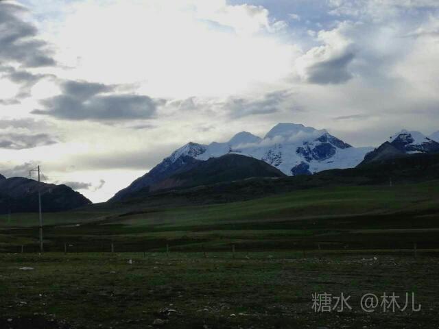雄伟的山坡披上了略有略无的翠绿盛装:远处白色的雪峰依旧那么的雄伟壮观。