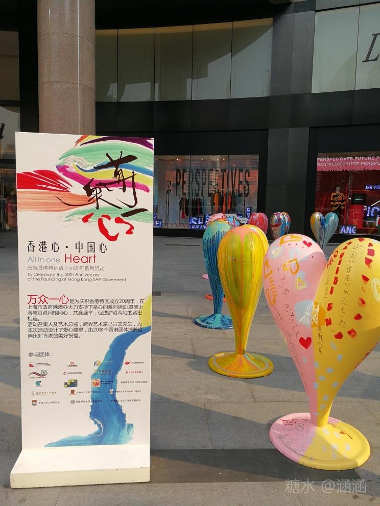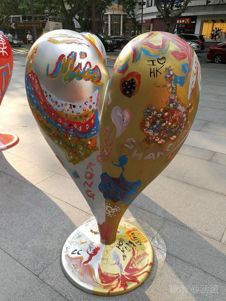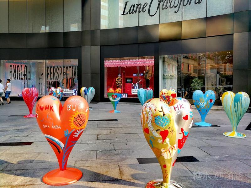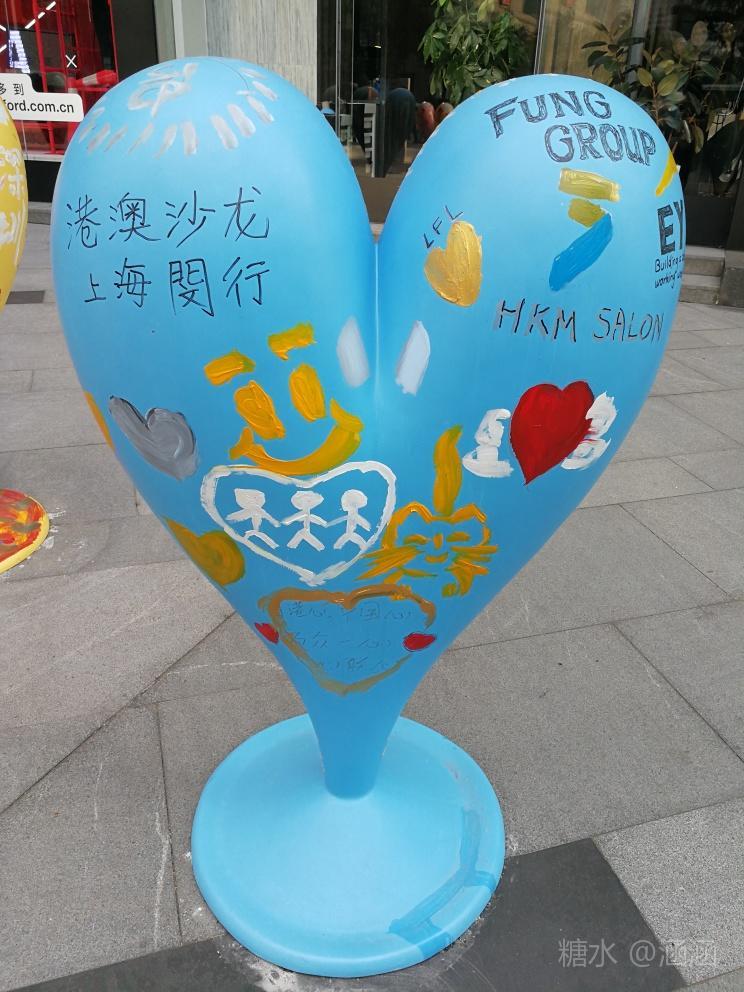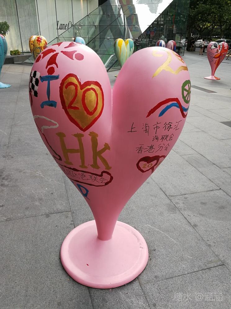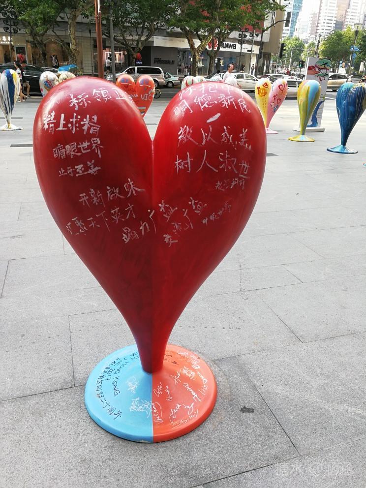 爱心雕塑群于6月24日在上海新天地南里广场展示,人们可以共同参与爱心雕塑艺术创作活动,并写下祝福话语。