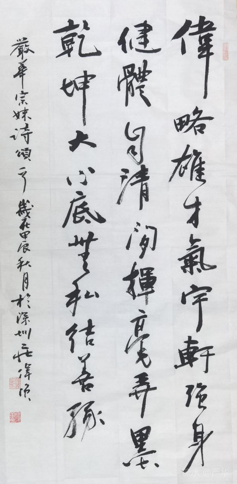 为香港书法家 庄伟强宗兄作诗一首 文/严华 伟略雄才气宇轩 强身健体自清闲, 挥毫弄墨乾坤大, 心底无私结善缘。 严华撰,书法家庄伟强书