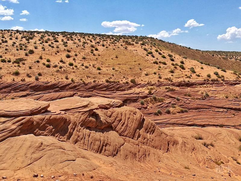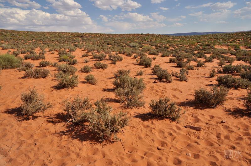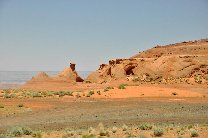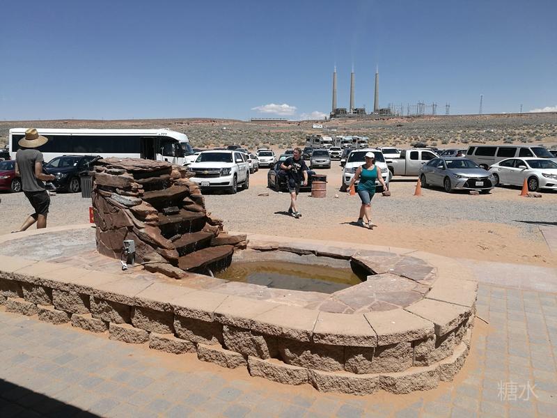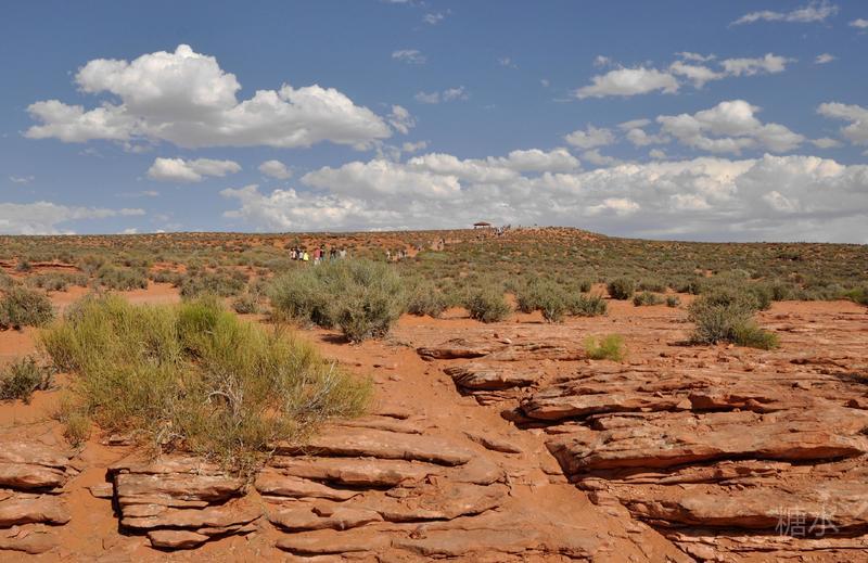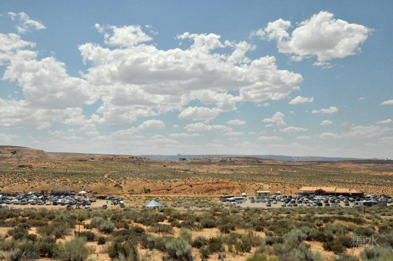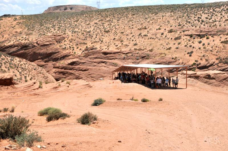 离开下羚羊谷前往不远处的马蹄湾。从停车场到景点还要走1英里(1.6公里)的细沙路,远处的凉亭为中途休息处。