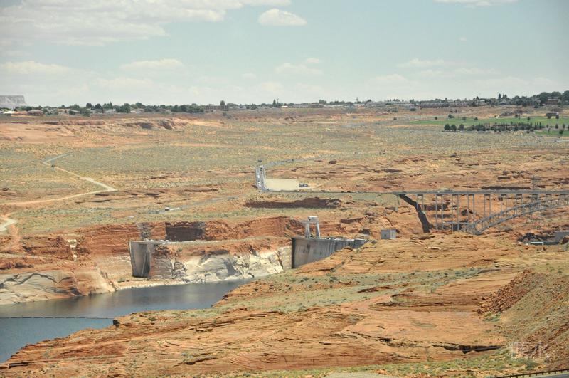 沿着89号公路,经过鲍威尔湖上雄伟的钢铁大桥后就来到了佩吉。216米高的格伦峡谷大坝拦截了科罗拉多河水,1963年大坝建好后开始关闸蓄水,由此形成的鲍威尔湖,现在是美国的第二大人工湖。