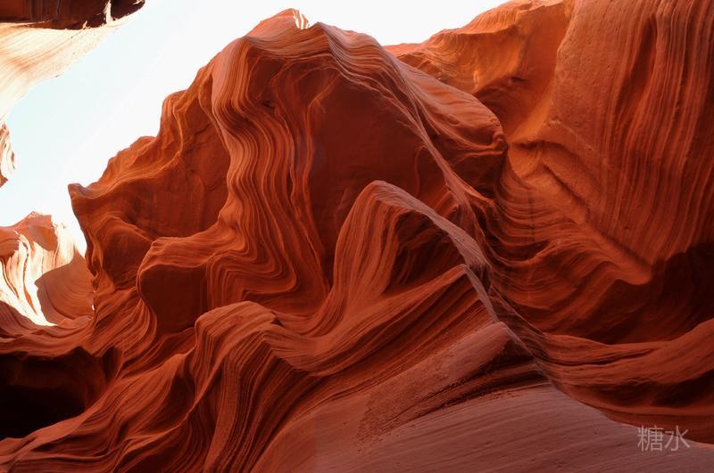 在旱季狂风吹过峡谷,把峡谷两侧的沙岩打磨得光滑圆润。日复一日、年复一年,风沙将红色沙岩凿成流水般的纹路形状。