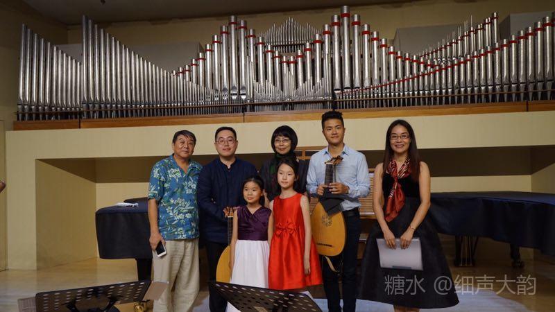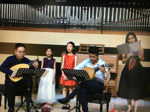 演出结束合影。 由左至右: ——成人组 梁新明(现代乐器文化公司创始人,演出策划) 张洛菩(留德鲁特琴与吉他双修演奏员) 陈谊(中央音乐学院吉他教授,演出策划) 范晔(留学瑞士归国吉他和鲁特琴双修演奏员) 杨冬(抒情女高音,独立嗓音艺术文化研究) ——少年组 梁雨儿(杨鸿年合唱团视唱班团员) 杨雅涵(杨鸿年合唱团预备一队队员)