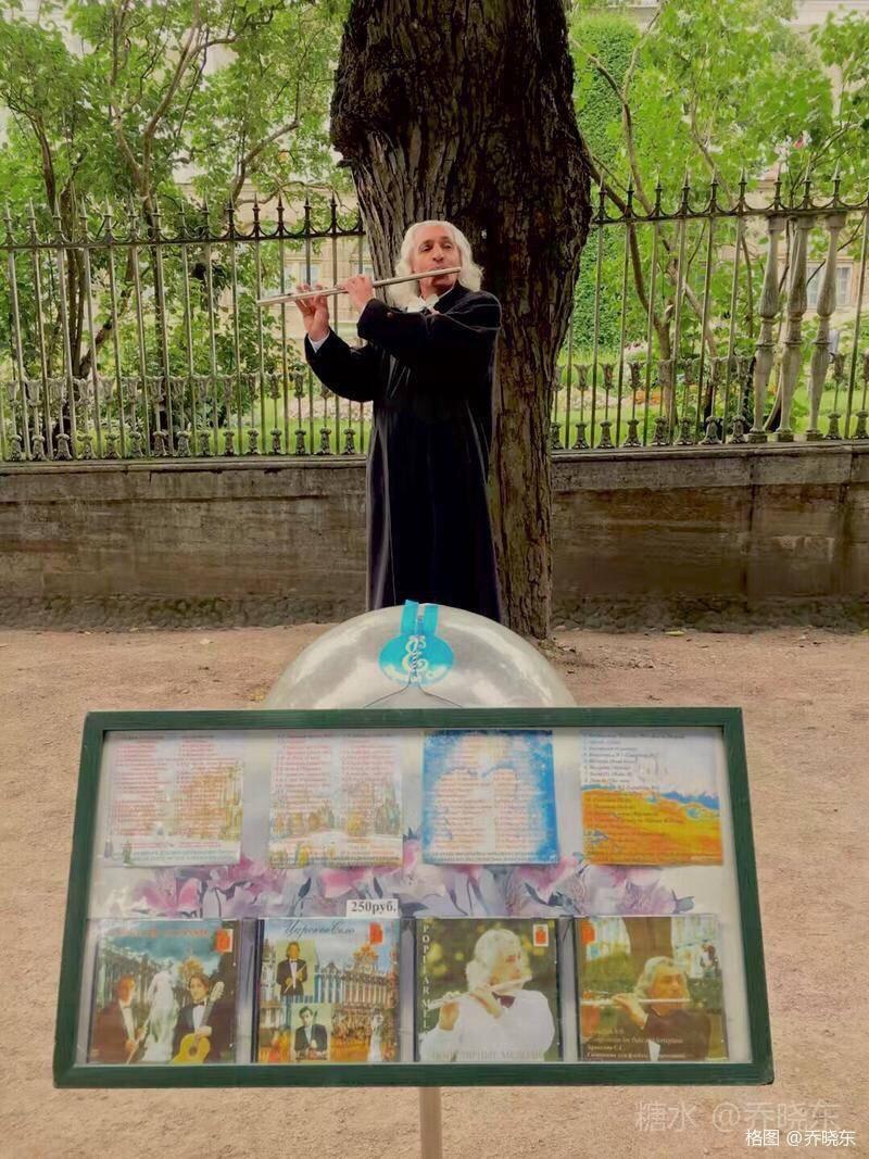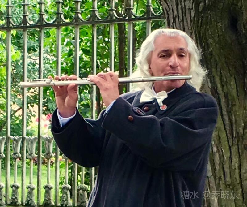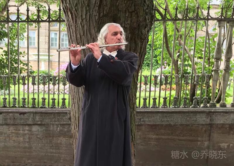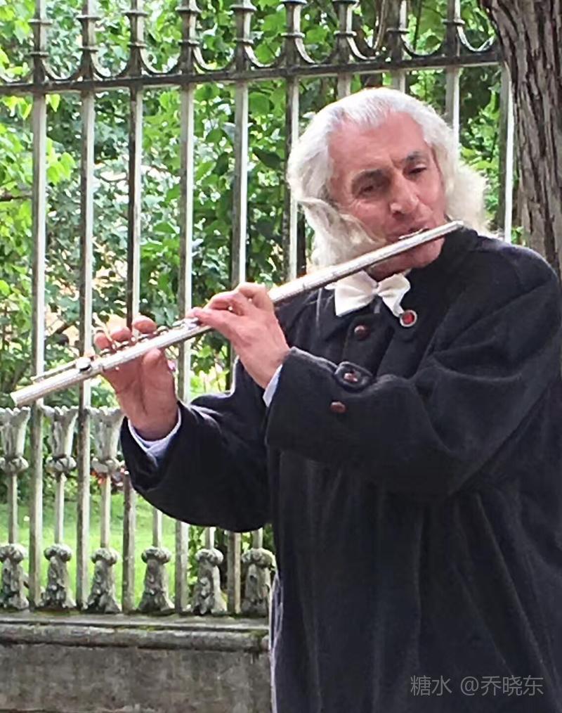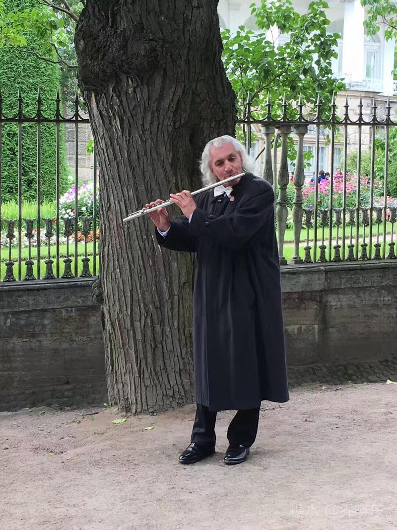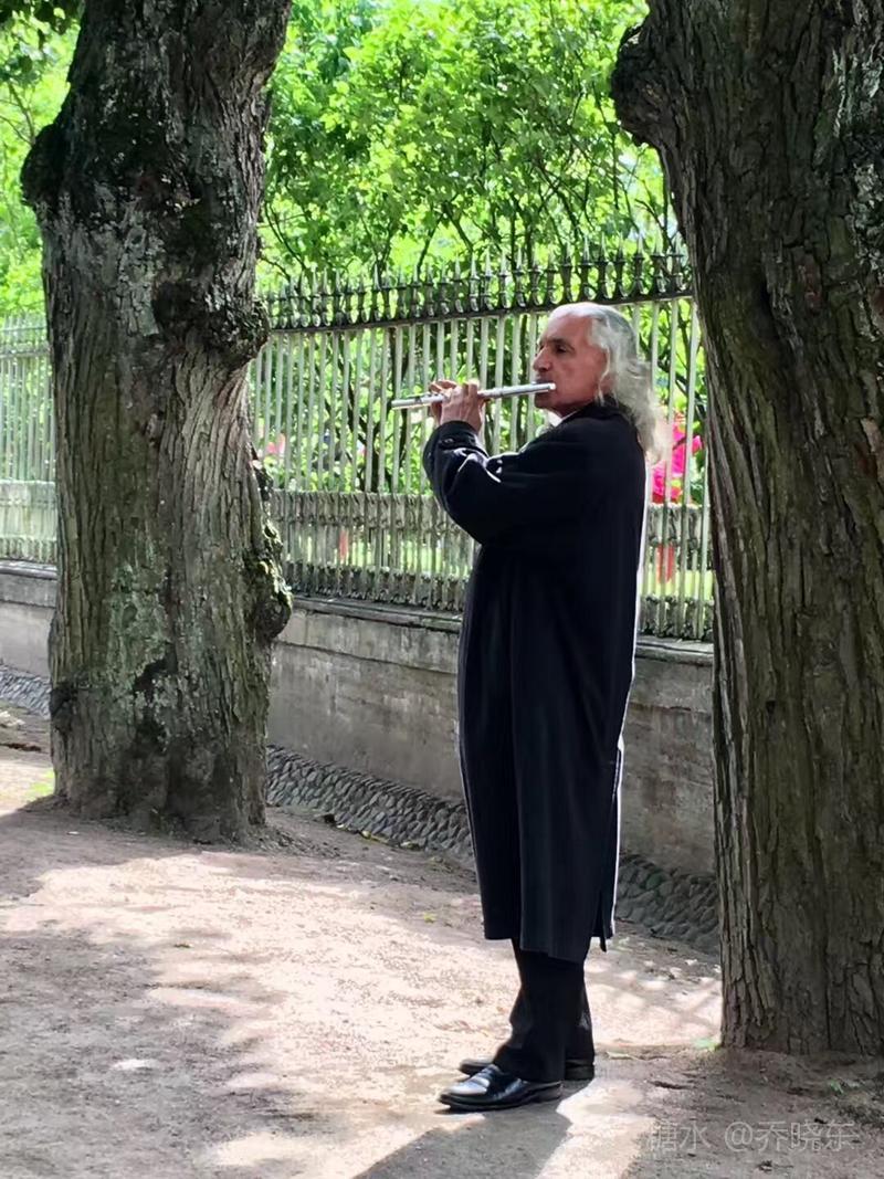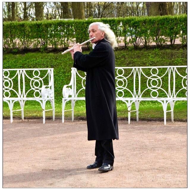 吹奏者一袭卷曲银发,在黑色风衣的衬托下格外显眼,领结规整而洁净,铮亮的皮鞋,一尘不染。