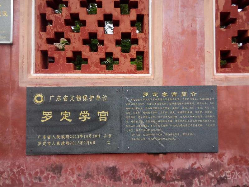 罗定学宫(孔庙),与罗定中学相邻,占地6300平方米。始建于顺治四年,俗称文庙,是清代罗定直隶州的学宫。当时由清代康熙至光绪年间历经修缮扩建而成,是目前西江流域仅存的清代学宫建筑群。 罗定学宫(孔庙),与罗定中学相邻,占地6300平方米。始建于顺治四年,俗称文庙,是清代罗定直隶州的学宫。当时由清代康熙至光绪年间历经修缮扩建而成,是目前西江流域仅存的清代学宫建筑群。 作为当时州县的学宫文庙,一般按照“左庙右学”的形式来布局,以左为尊,文庙的建筑按中轴对称的形式来排列。罗定学宫,前为照壁,次为棂星门,再次泮池,再次大成殿,组成院落,最后是崇圣祠,其他建筑则相应排列于轴线两边,俨然一座完整的宫殿,所谓学宫的含义即如此。 棂星门是学宫的大门。罗定学宫棂星门为花岗岩四柱的石牌坊,高台阶,四柱高大,石鼓夹抱,石柱顶雕瑞兽以“避邪”。罗定学宫棂星门在岭南地区是最高的,达7.64米,成为学宫的突出标志。