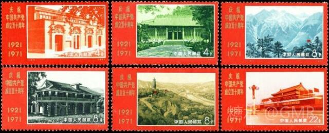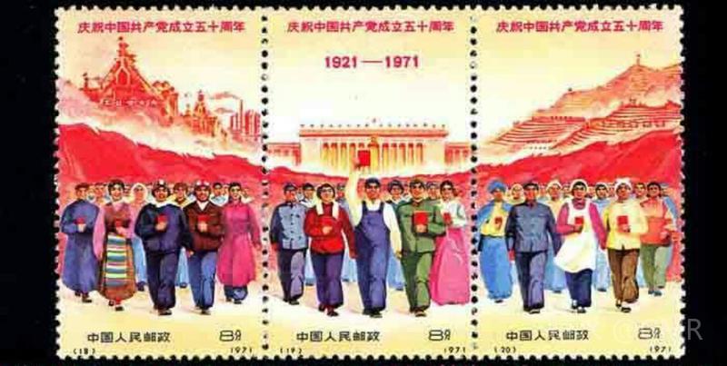 1971年7月1日发行编号为12-20的《庆祝中国共产党成立五十周年》纪念邮票,全套9枚。图案分别为“中国共产党第一次代表大会会址(上海)”、“广州农民运动讲习所”、“革命摇篮井冈山”、“遵义会议会址”、“革命圣地延安”和“首都天安门”;其他3枚“奋勇前进”为连票,图案为并肩前进的工农兵和各族人民群众