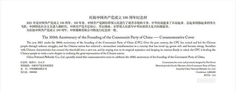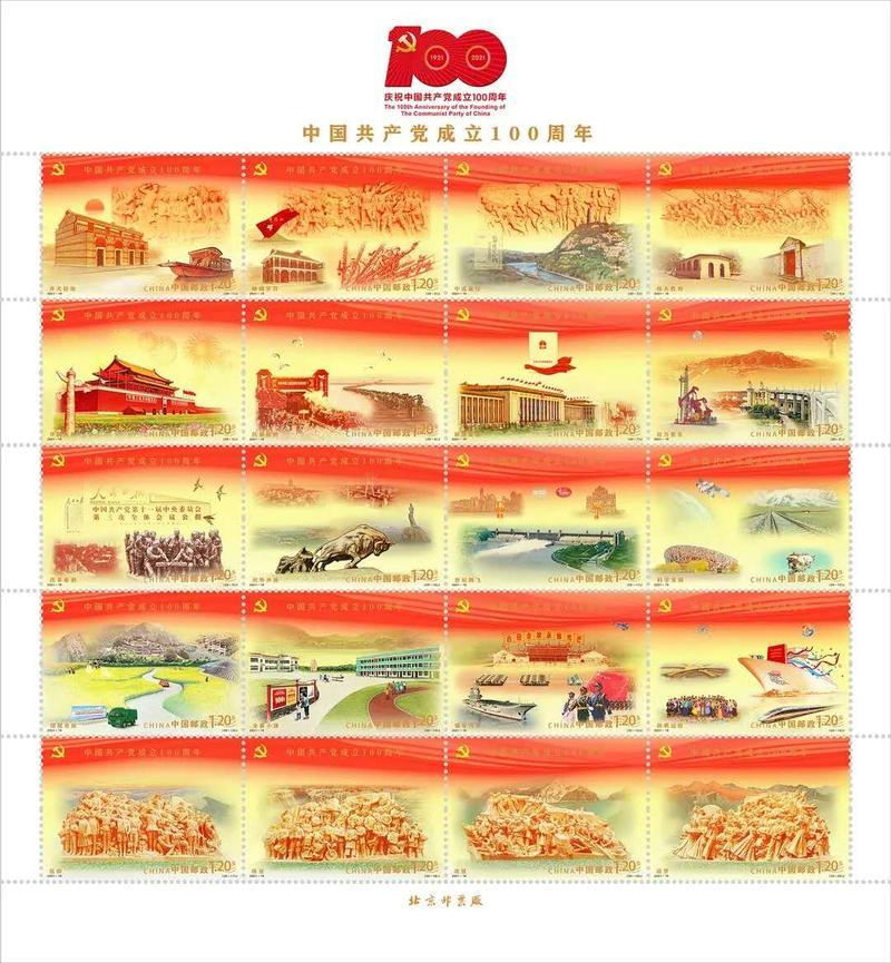 中国邮政于2021年7月1日发行《中国共产党成立100周年》纪念邮票1套20枚,纪念封1套1枚。纪念邮票内容分别为:1.开天辟地;2.峥嵘岁月;3.中流砥柱;4.伟大胜利;5.开国大典;6.抗美援朝;7.制度奠基;8.自力更生;9.改革春潮;10.对外开放;11.世纪腾飞;12.科学发展;13.摆脱贫困;14.全面小康;15.强军兴军;16.扬帆远航;17.信仰;18.伟业;19.攻坚;20.追梦。邮票采用连票设计形式,以红色、金色为画面主基调,运用油画写实手法表现,并采用连绵不断的飘带贯穿整体,寓意中国共产党百年奋斗的光辉历程。 《庆祝中国共产党成立100周年》纪念封采用党徽、“不忘初心 牢记使命”金色字样、庆祝中国共产党成立100周年活动标识、中国共产党历史展览馆大型漆壁画作品《长城颂》等作为表现元素。