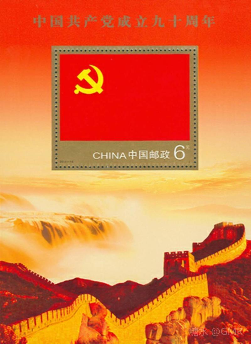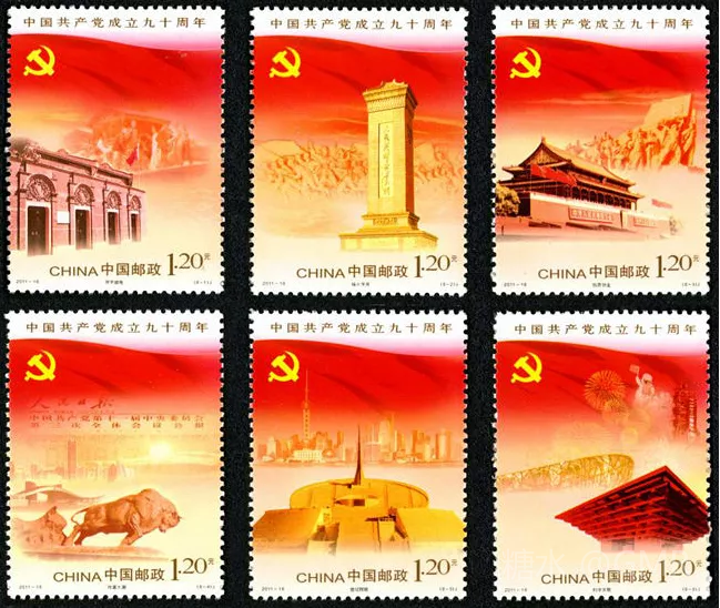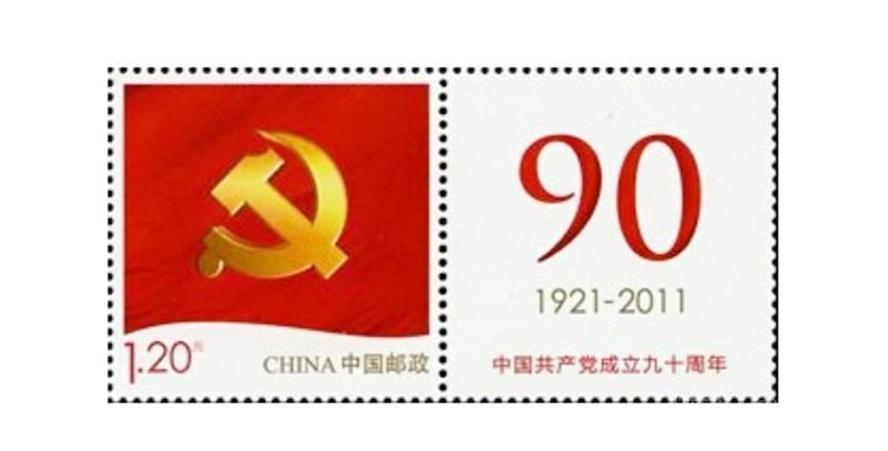 2011年,是中国共产党成立90周年。中国邮政于6月22日提前发行《中国共产党成立九十周年》纪念邮票,全套6枚,小型张1枚。邮票图案分别为《开天辟地》、《峰火岁月》、《执政创业》、《改革大潮》、《世纪跨越》和《科学发展》。6枚邮票以飘动的党旗作为统一的背景,使画面连为一体,富有历史感