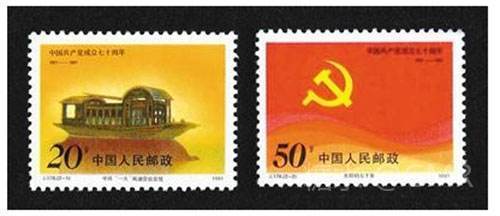 1991年7月1日,发行J178《中国共产党成立七十周年》邮票,全套2枚。邮票图案选取了中共一大南湖会议会址和党旗。第一枚邮票图案象征党的诞生使中国革命出现了曙光,形象地揭示了中共一大的历史意义。第二枚邮票上,党旗下方有弯曲的彩色线条,画面充满动感,使党旗如同在空中飘扬一般,象征党指引全国人民走向胜利