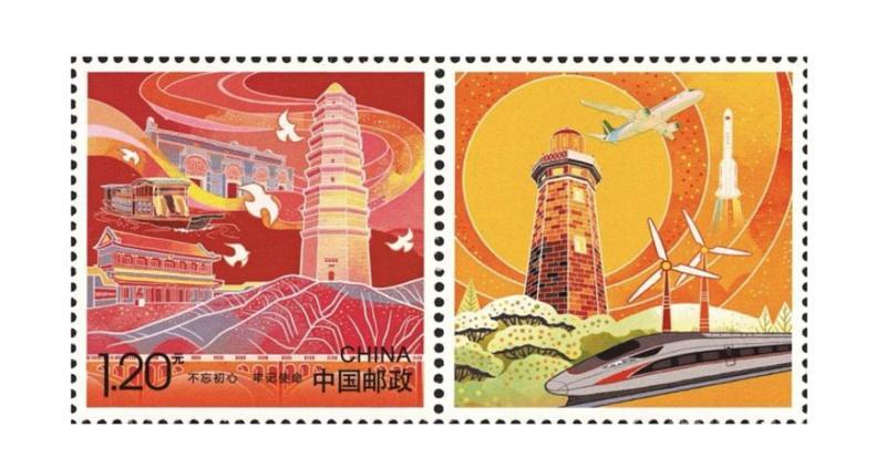 为配合开展“不忘初心,牢记使命”主题教育,中国邮政于2018年7月1日发行,全套1枚。主图由上海中共一大会址、嘉兴南湖红船、延安宝塔山、中南海新华门等为主体元素,辅以和平鸽等辅助元素;附票图案由灯塔、高铁、火箭、国产大飞机、风力发电等元素组成。