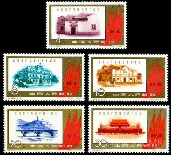 1961年7月1日,发行纪88《中国共产党成立四十周年》纪念邮票,全套5枚。邮票选取了5个在党的历史上具有纪念意义的建筑作为图案,分别为中共一大上海会址、南昌八一大楼、瑞金中央大礼堂、延安宝塔山、北京天安门,展现了党从诞生到建立新中国的光辉历程