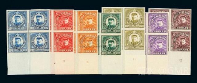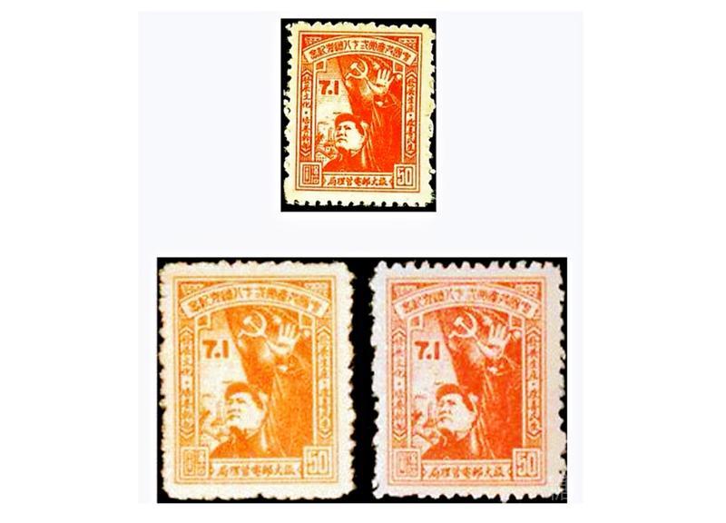 1947年7月1日,东北邮电管理总局发行的《中国共产党二十六周年纪念》邮票。全套4枚,面值有10圆、30圆、50圆、100圆,采用东北币币制。分别为红色、玫红、紫红、橘红。图案是毛泽东头戴八角帽的正面像,背景为中国共产党党旗。这是我国最早发行纪念中国共产党成立的邮票
