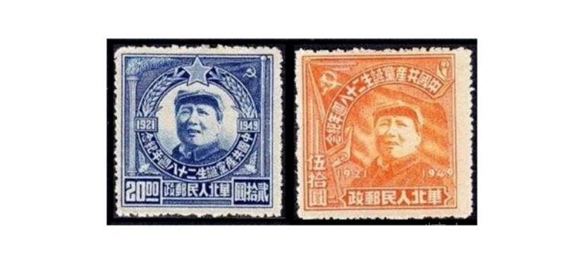 1949年7月1曰,华北解放区的华北邮电总局发行《中国共产党诞生二十八周年纪念》邮票。7月6日发行无齿票,全套7枚。图案为毛泽东像和党旗