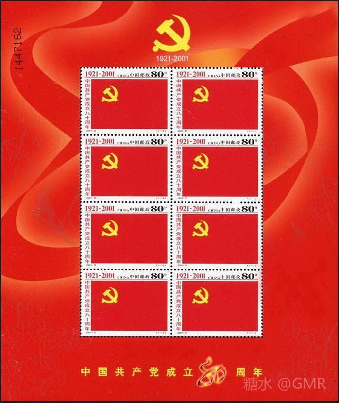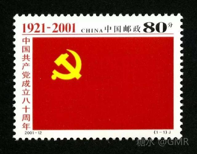 2001年7月1日,发行《中国共产党成立八十周年》纪念邮票,全套1枚。图案为一面庄严的党旗,象征着党引导中国人民在新时期勇敢前进,不断创造辉煌