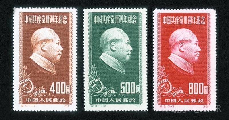 1951年7月1日,中国邮政发行纪9《中国共产党三十周年纪念》邮票一套3枚,并于1955年1月10日再版。3枚邮票同图,面值和颜色不同。图案为毛主席右侧面石膏浮雕头像,左下角附以橄榄枝和党徽,以及1921-1951字样,这是新中国成立后发行的首套建党纪念邮票