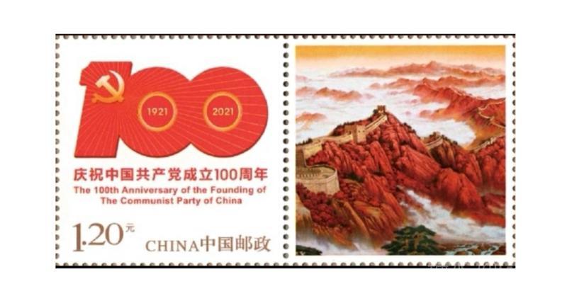 中国邮政2021年7月1日发行,全套1枚。主图为中国共产党成立100周年庆祝活动标识;附票图案选自中国共产党历史展览馆大型漆壁画《长城颂》。