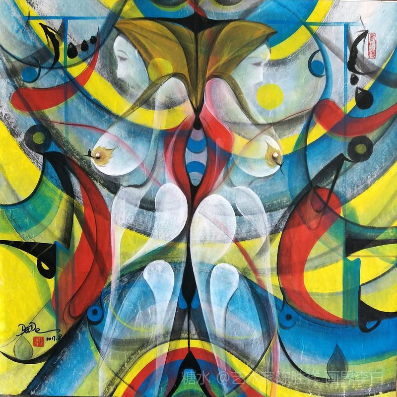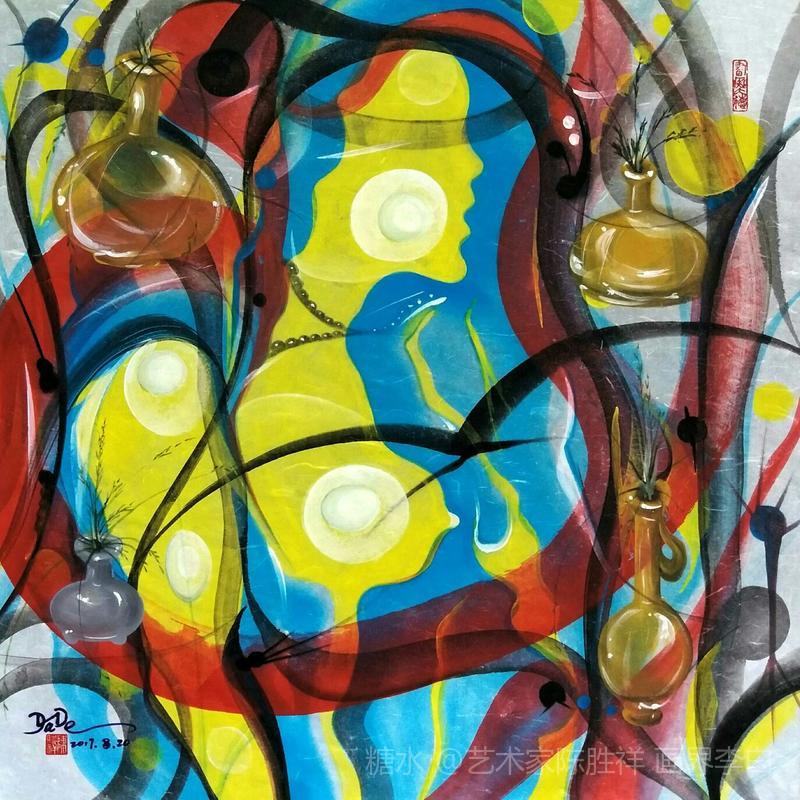 品读实力派抽象艺术家陈胜祥彩墨最新作品 巜女神》系列随想 品读陈胜祥老师的抽象画,眼睛总是明快闪亮的。作品中色彩的主题永远是蓝色,蓝色在我的意想中是爱的象征,是博大辽阔的天空,是海纳百川的包容,是男人坦荡的胸怀,是女人滋润的乳汁。这幅作品有三个主题:一对男女相约在江河与湖水之畔,月夜下背对背肩靠着肩窃窃私语,倾诉爱的思恋。二是在画面四周布满了胴体色花甁,花瓶反映的光影似月牙在盛满银色里微微荡漾,看得出如少女的微笑,有一种平静如斯的美。三是在少女含羞的脸颊有一小白点,当然,我视为星光,是星星陪伴在少女身旁,不让那位多情男子接近触碰,因此,故作调皮,那男子很着急,只好背对着少女用心贴近少女欣赏湖水里、花瓶中含笑的月亮。 抽象艺术是走在时代前沿的阵地,包罗万象,举一千众。我每欣赏一次抽象画,脑海里总会激起千层水波,万种想象,诗意会游离在画面结构和色彩融合的妙思意想之中,同时也非常欣赏陈胜祥先生千姿百态的《女神》系列作品。
