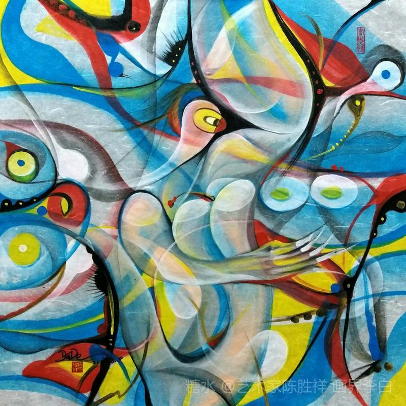 品读实力派抽象画家陈胜祥彩墨最新作品 《女神》系列随想 读实力派抽象画家陈胜祥老师《女神》系列近日最新作品,我第一眼,从蓝莹莹清新丽雅的色彩画面中看见的是:一个抱膝半卧的少女,突出的眼睛含有各种饱满的表情,面部似象在呻吟又似象在张口呼吸。将视觉随着画面的线条和色彩移动,又看见一双温厚的大手将女孩紧紧握在手心,生怕女孩一不小心会从指缝滑走,一双大大的眼睛,长长的睫毛下包含爱的温情,一往情深。用抽象的思维去看整个画面的构图、色彩、线条的延伸,各种元素语言都在宣低上灵活的跳跃,表现出极大的张力。有天空、树林,飞鸟、清溪等等,可将赏画者思维穿越到千年的远古神话时代,也可即时将思绪拉回到当今的现代。正如名言所序“我们的艺术应当比现实站更高,应当使人不脱离现实,又高于现实”一一高尔基