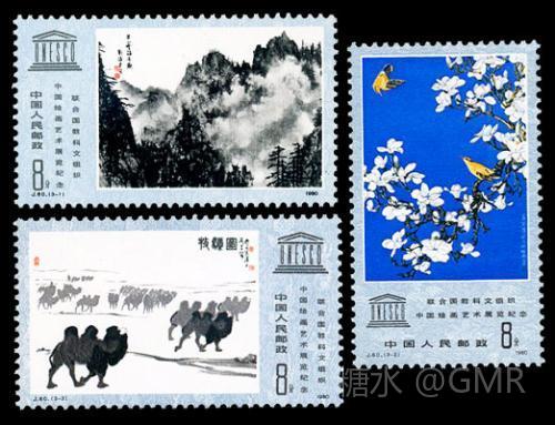 1980年10月8日,应联合国教科文组织要求,我国发行了J60《联合国教科文组织中国绘画艺术展览纪念》邮票,共3枚,第一枚“黄山云海奇观”邮票图案采用的是我国现代著名画家刘海粟的绘画作品