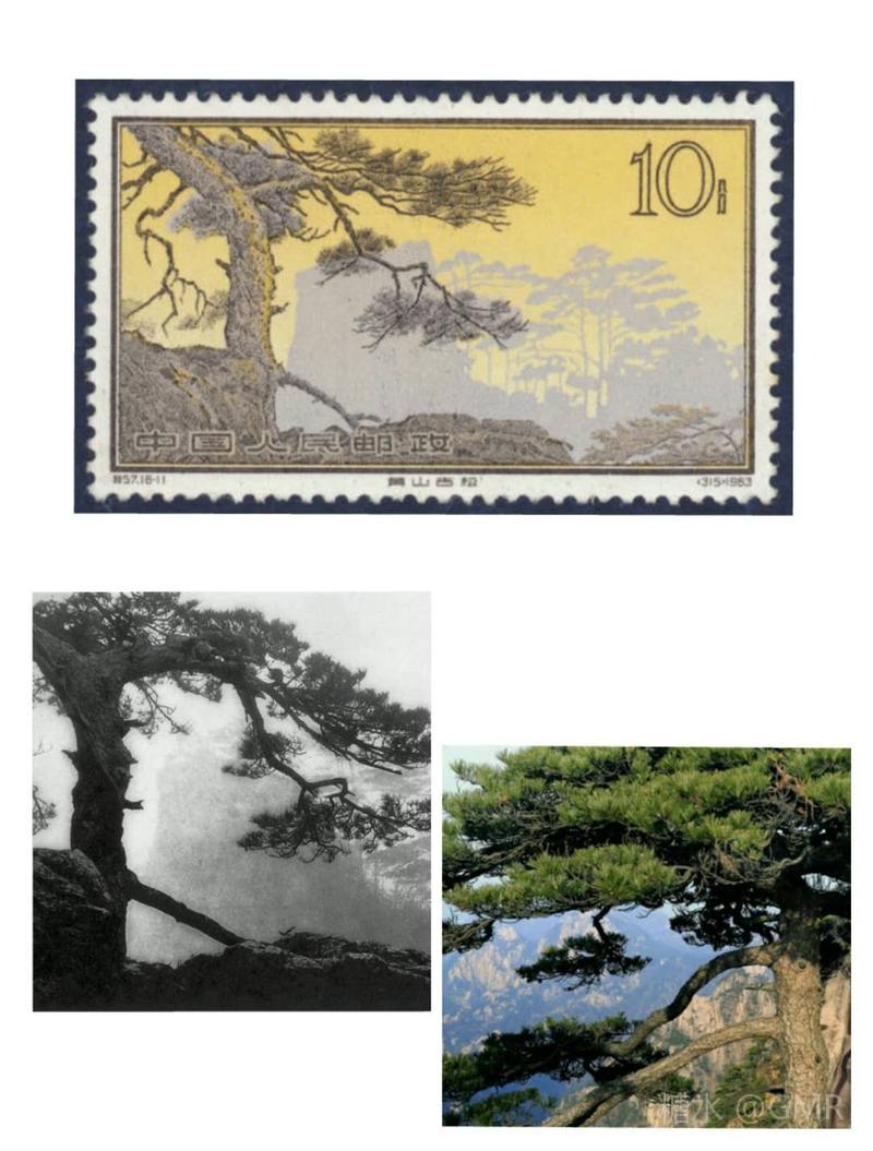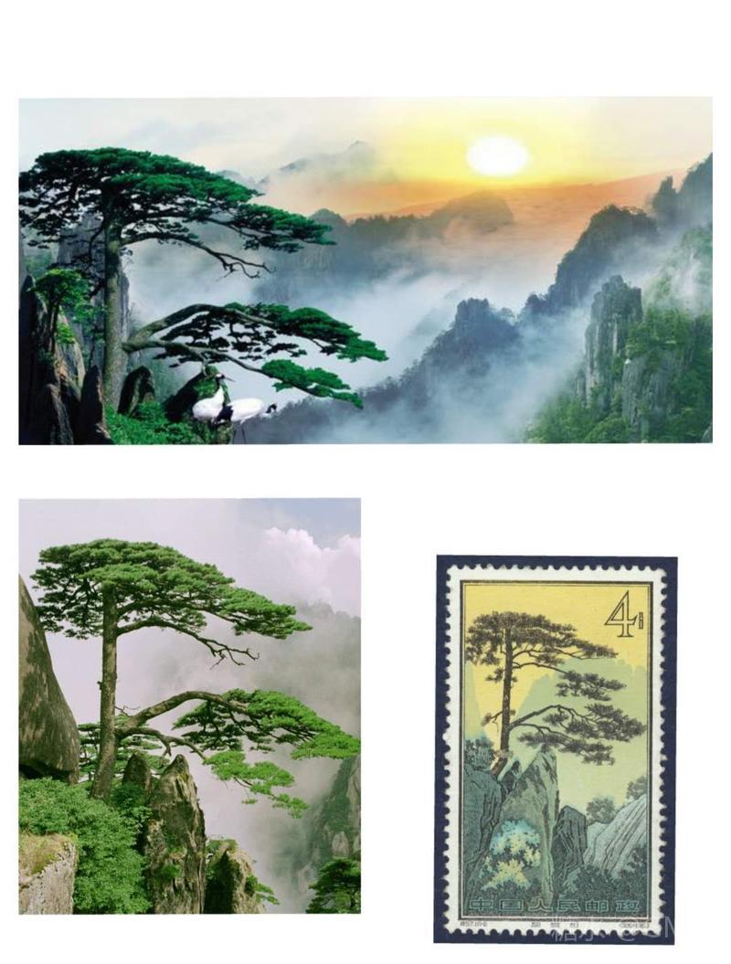 图案以柔和明亮的天色和淡雅清爽的山峰松林为背景,将镜头对准了生长在始信峰上的黄山古松:粗壮的根深深地扎在岩缝之中,枝干突破图案边框伸向云天之外,气势雄伟,生动地塑造了一种傲霜斗雪的顽强性格