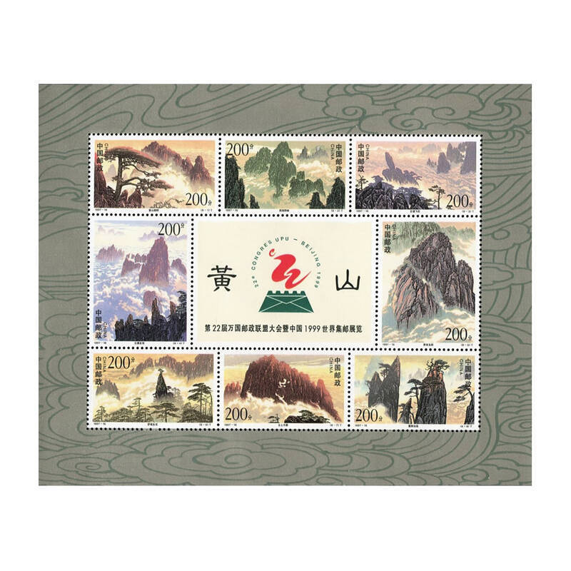 第22届万国邮政联盟大会暨中国1999年世界邮展,国家邮政局于1997年10月20日发行了《黄山》特种邮票(小版张)1套8枚 分别是:(8-1)200分黄山朝晖;(8-2)200分西海群峰;(8-3)200分云涌飞石;(8-4)200分云漫北海;(8-5)200分秀吞玉屏;(8-6)200分梦笔生花;(8-7)200分云上天都;(8-8)200分蓬莱仙岛