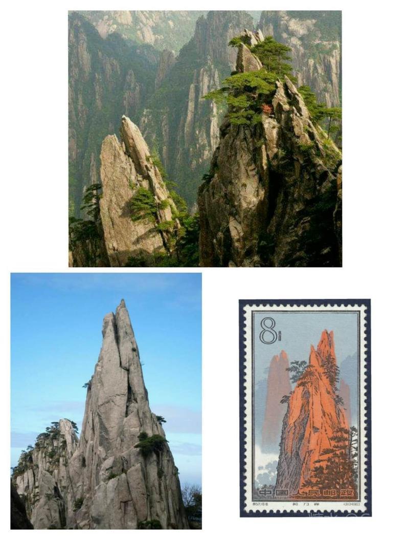 石笋峰上一根根石柱矗立,形若竹笋,人们称之为“十八罗汉朝南海”。黄山的石笋堪称天下三奇(雁荡的龙湫、匡庐的瀑布和黄山的石笋)之一。邮票图案上,一根根石柱参差林立,奇姿峥嵘,胜似雨后春笋,蔚为壮观