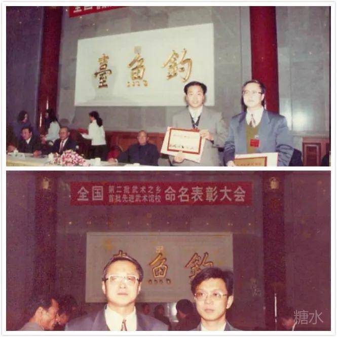 "全国武术之乡"命名表彰大会期间合影 左上图与时任山东省莱州市副市长王洪涛合影; 右上图与时任国际武联技委会主任、北京武术总教练、李连杰的师父吴彬合影; 下图与我国著名武术家赵长军合影。