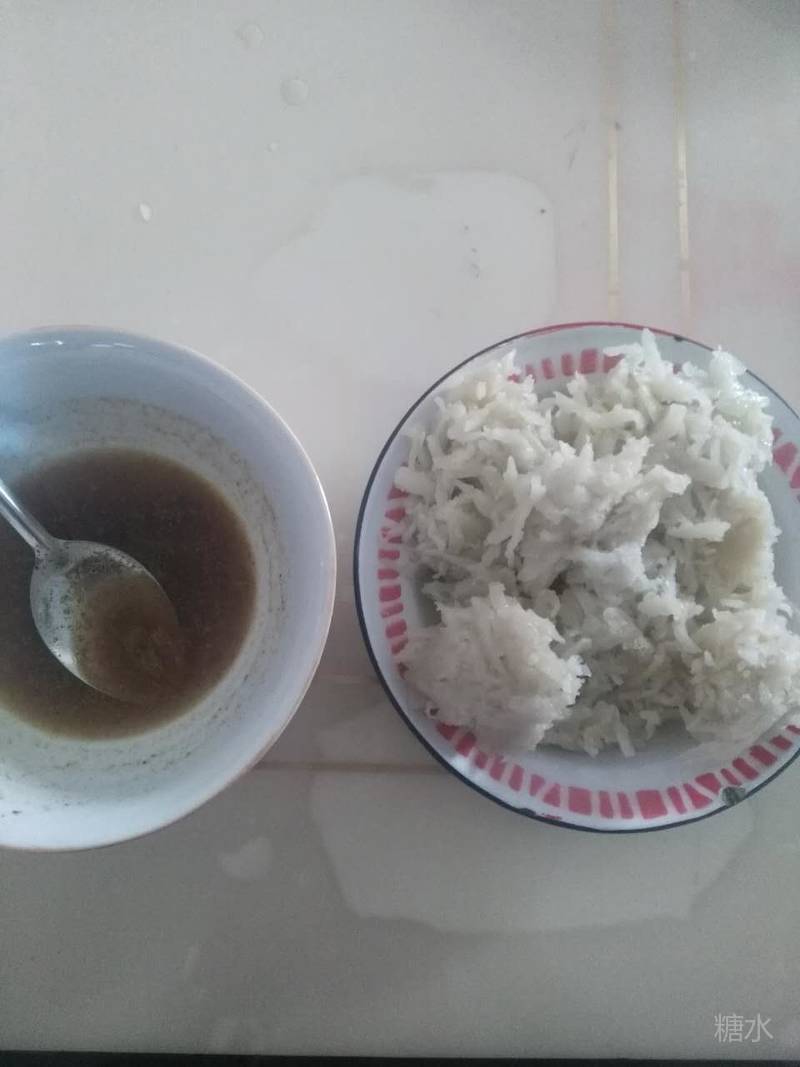 (三)土豆丝加淀粉蒸丸子(或拨烂子) 主料:土豆丝、淀粉(红薯淀粉、土豆淀粉均可)、白面等。 做法:先将土豆丝淘两遍,然后按2:2:1的比例加土豆淀粉、红薯淀粉、白面进去,搅拌好,捏成大丸子,放蒸布上蒸20到25分钟即可。蘸水萝卜、芝麻、醋、葱油汤。 优点:土豆做成丝,经淘洗去掉了大部分钾及嘌呤等,淀粉是肾炎患者的知音,两者是最佳搭挡。 注:血糖高蒸成莜面丸子。小孩宜把两种丸子蒸出来后,再搅拌一起,加油及黑肉炒更香。