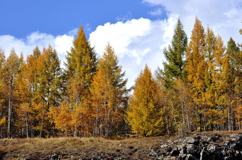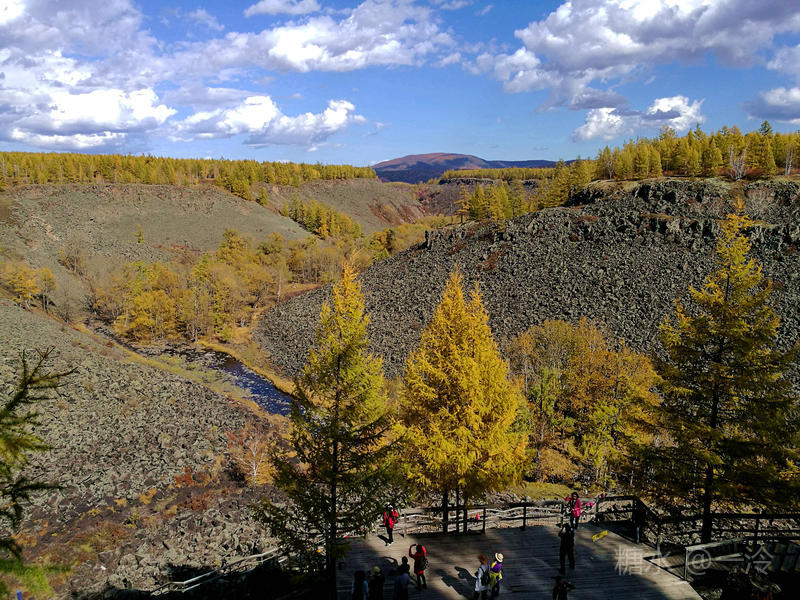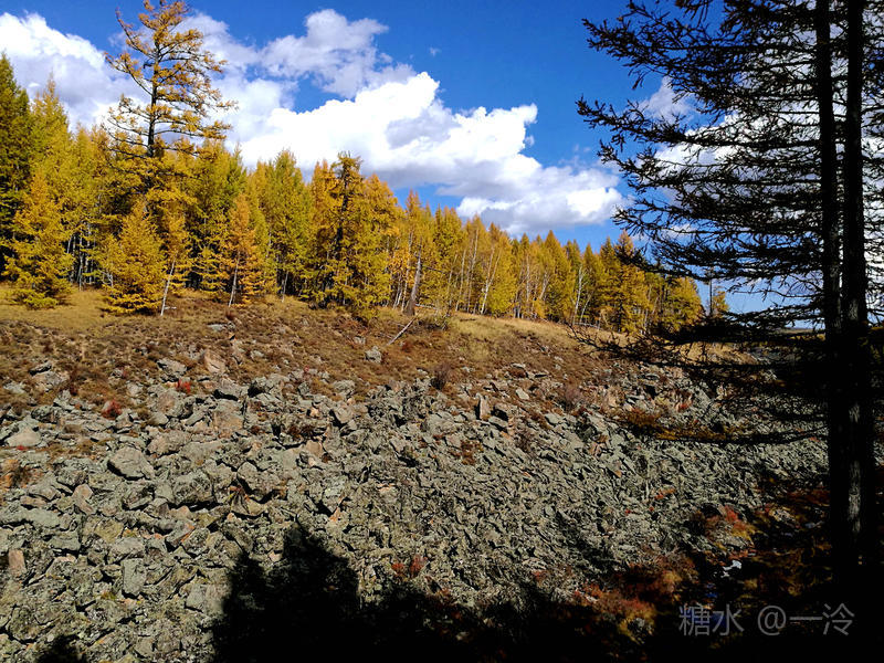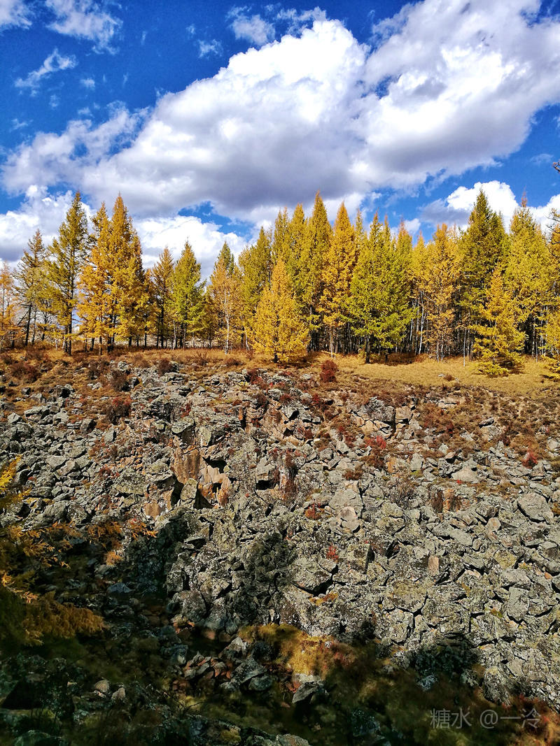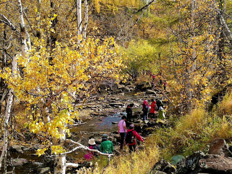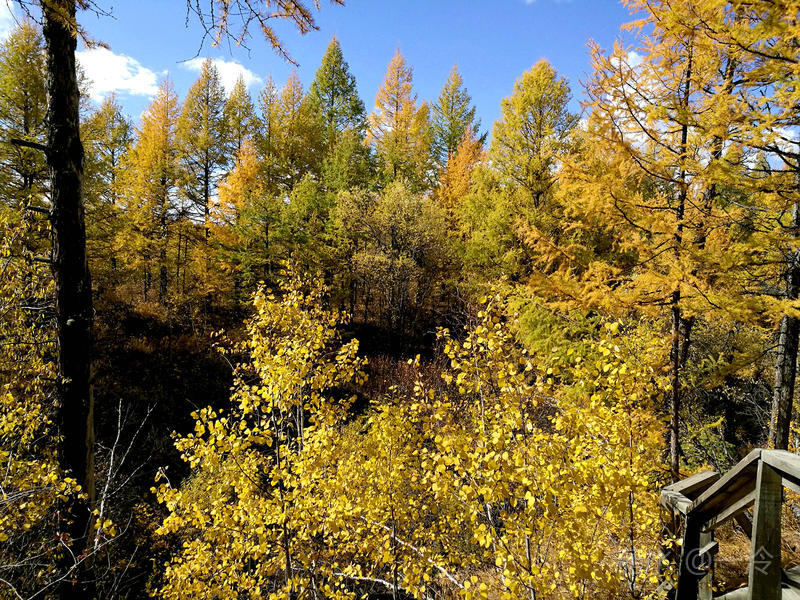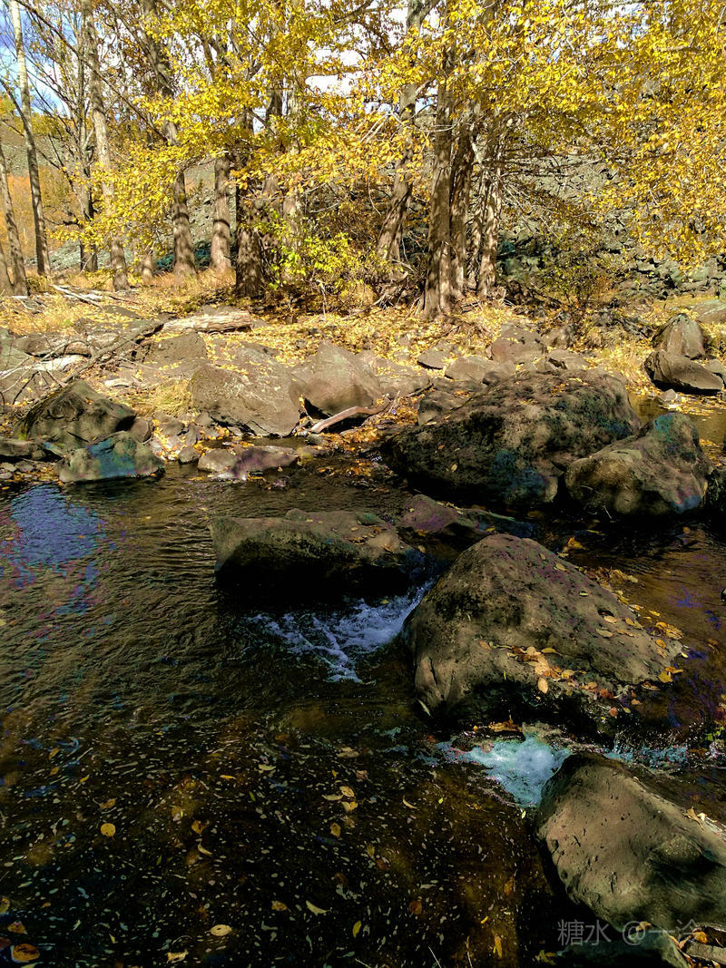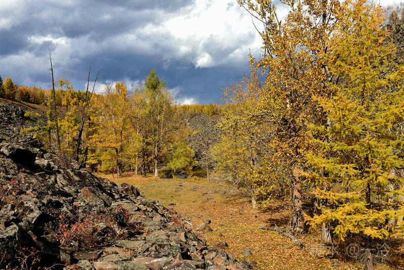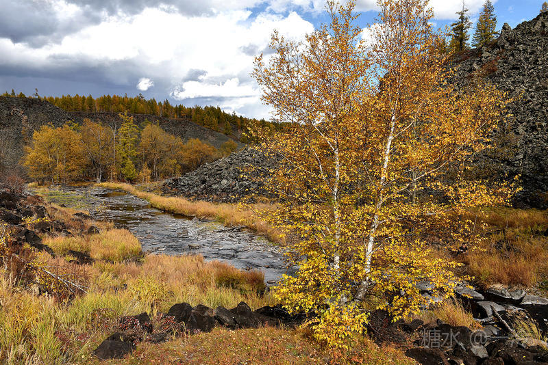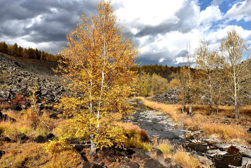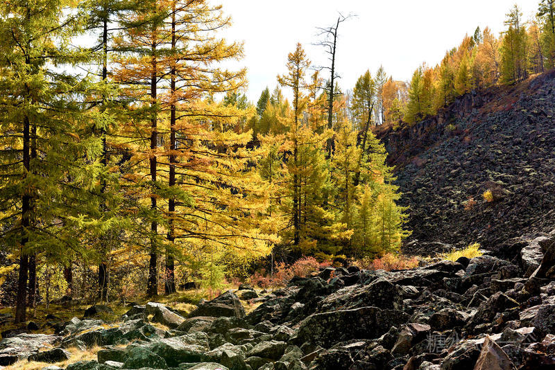 玄黑色的峡谷石块,金黄色的落叶松白桦树,犹如一幅斑斓多彩的油画。