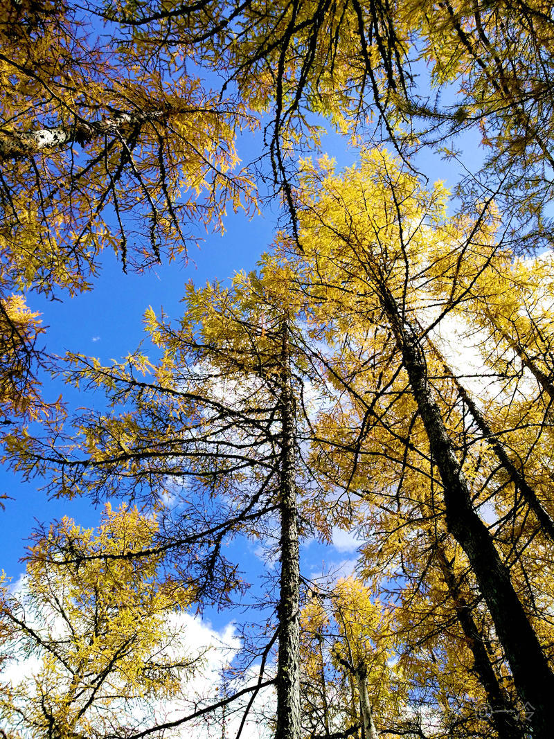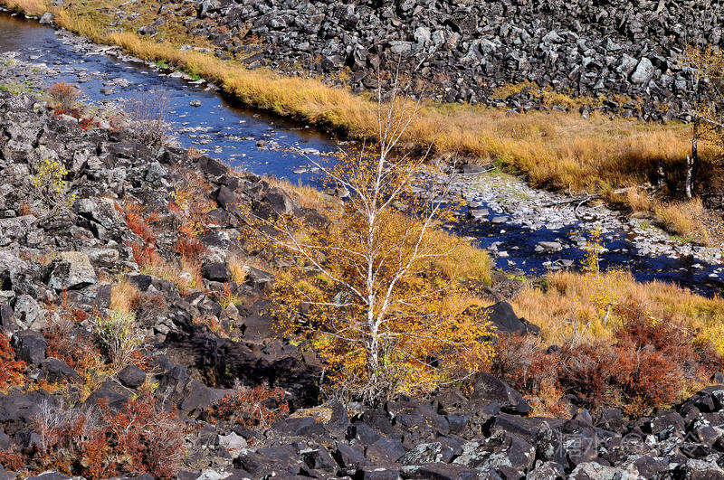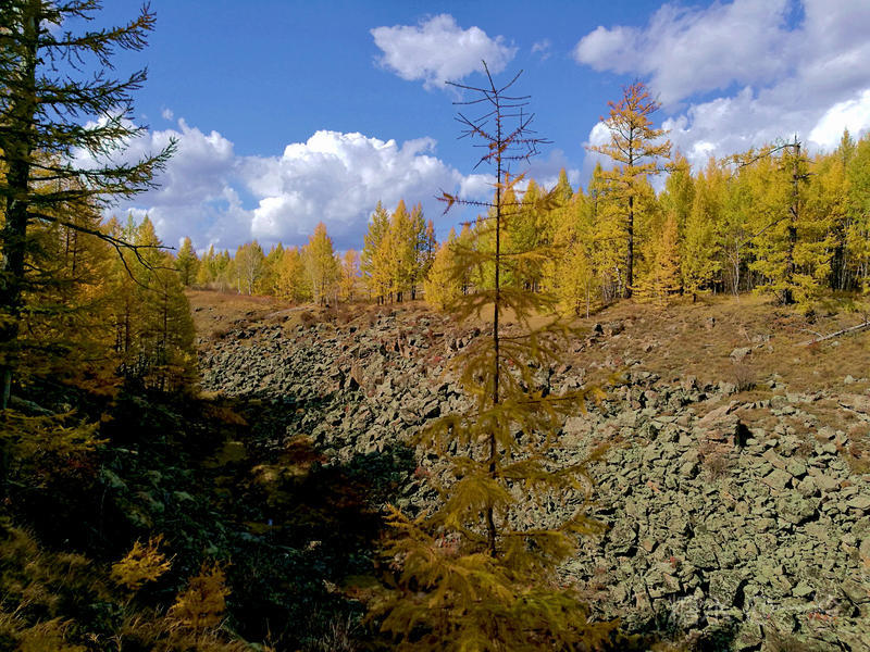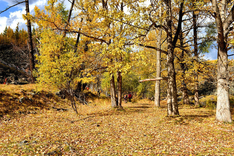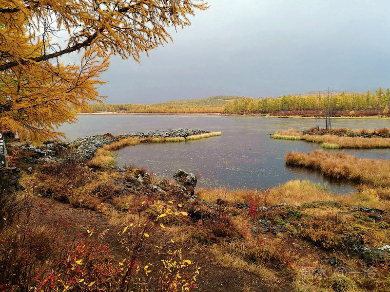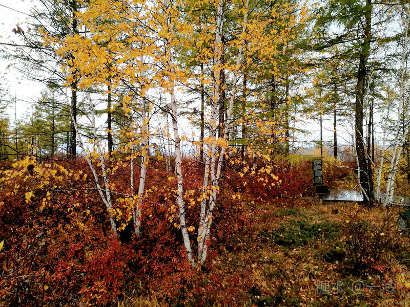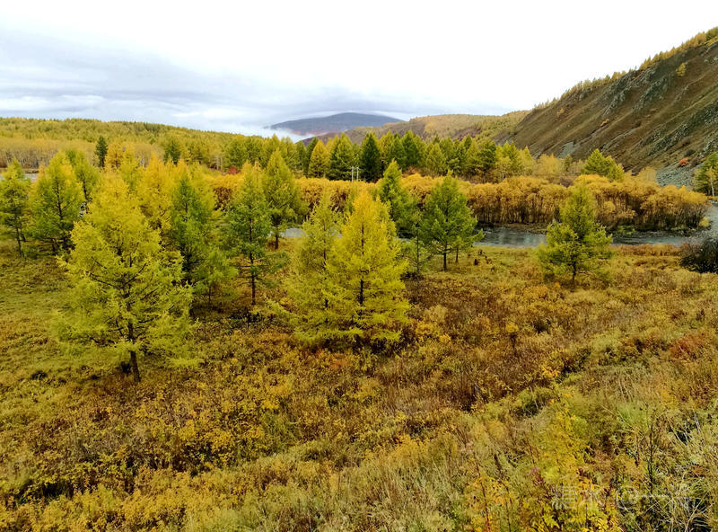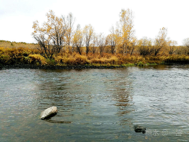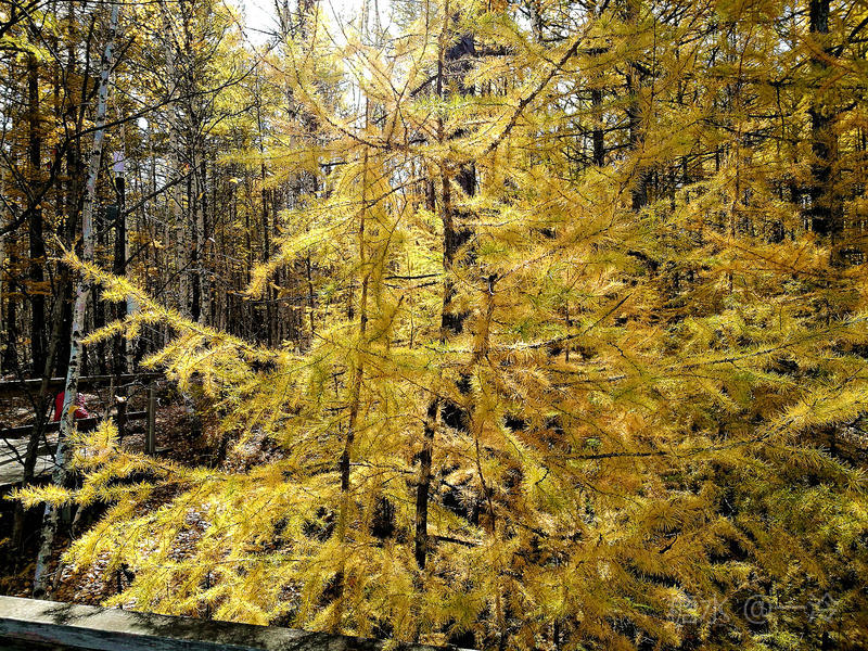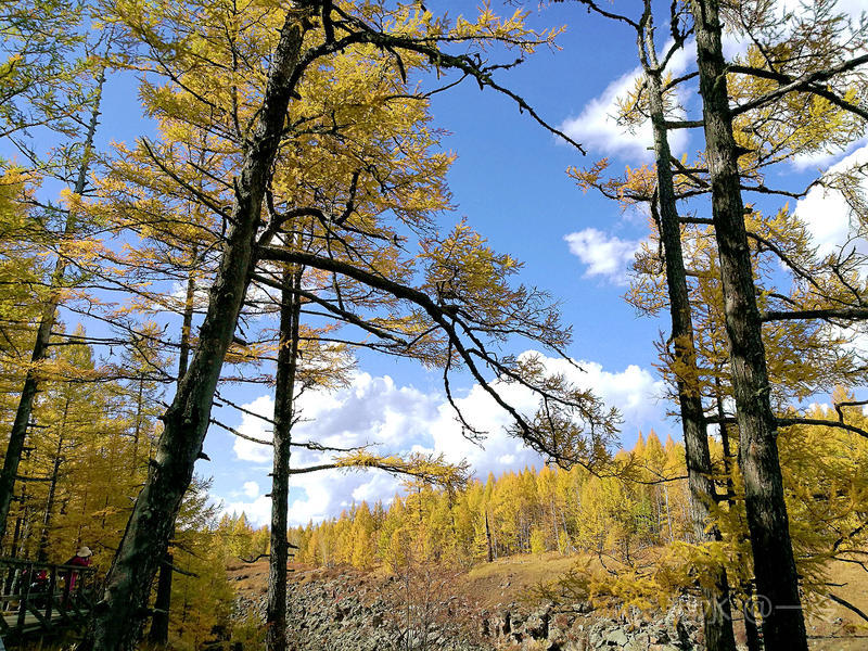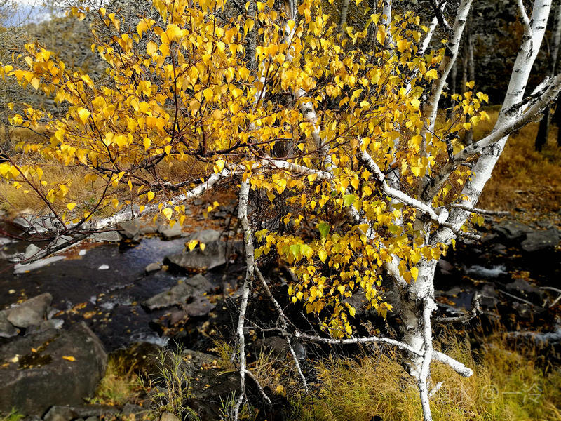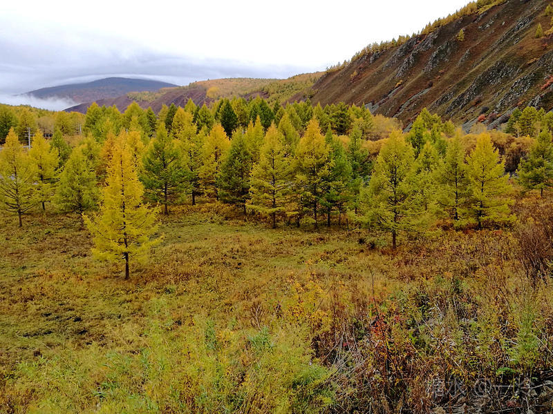 玄黑色的峡谷石块,金黄色的落叶松白桦树,犹如一幅斑斓多彩的油画。
