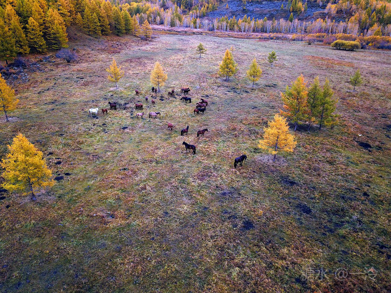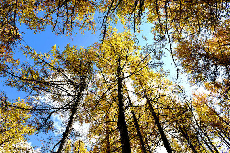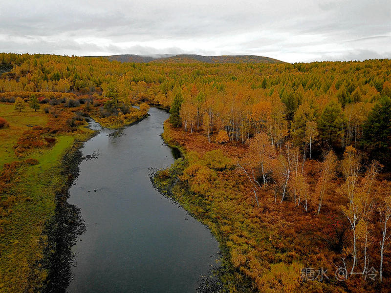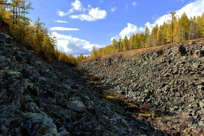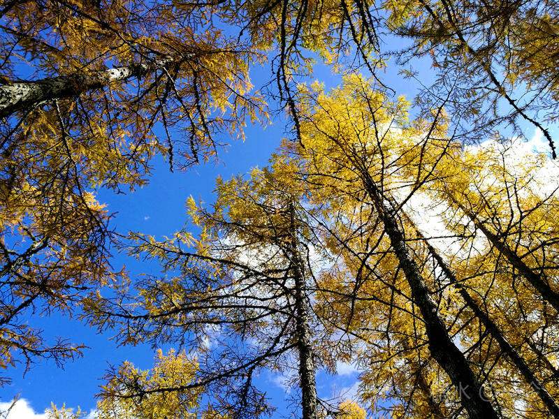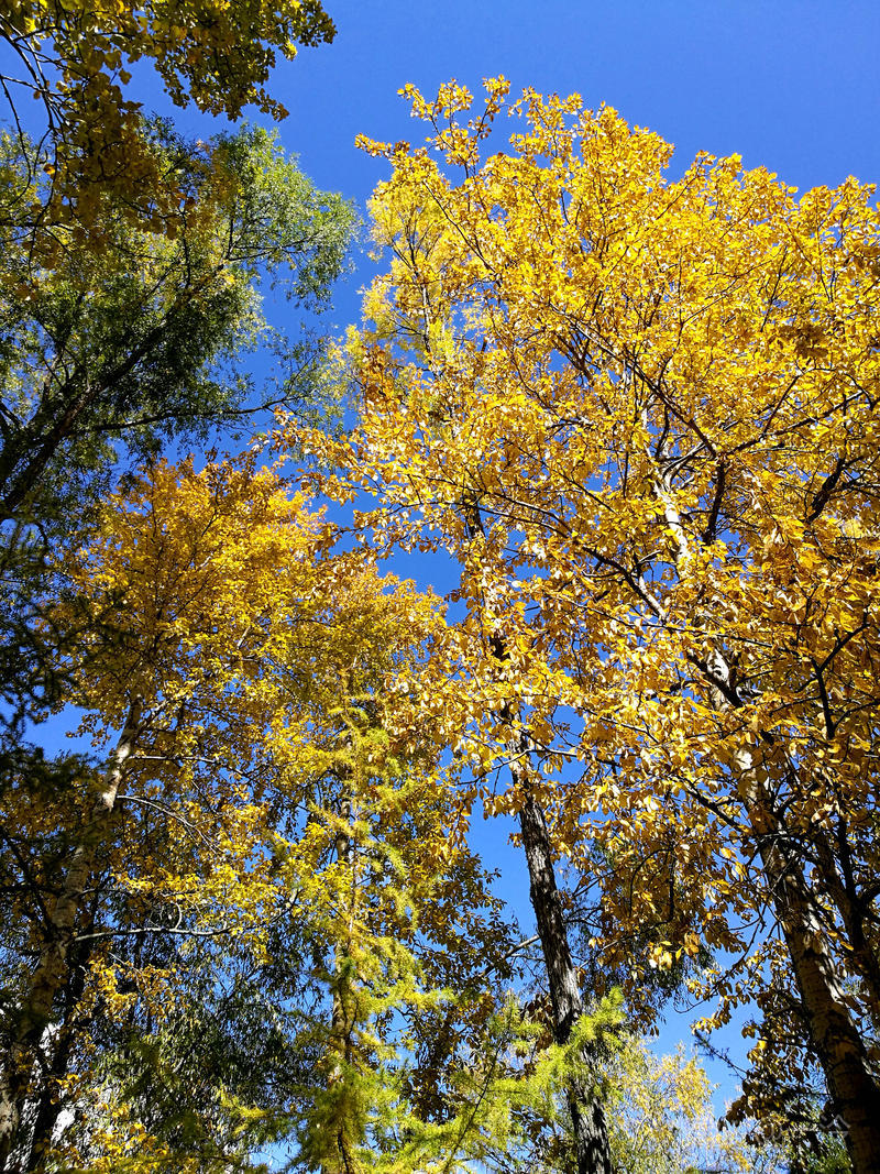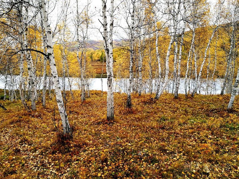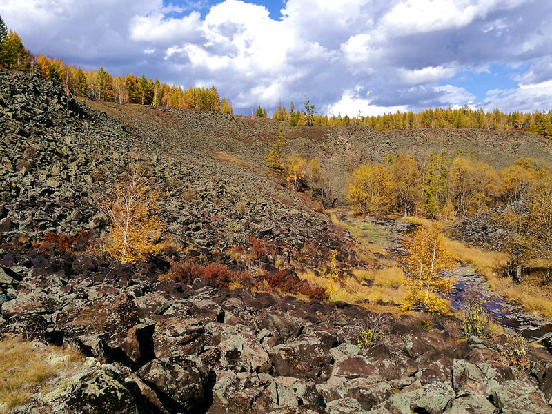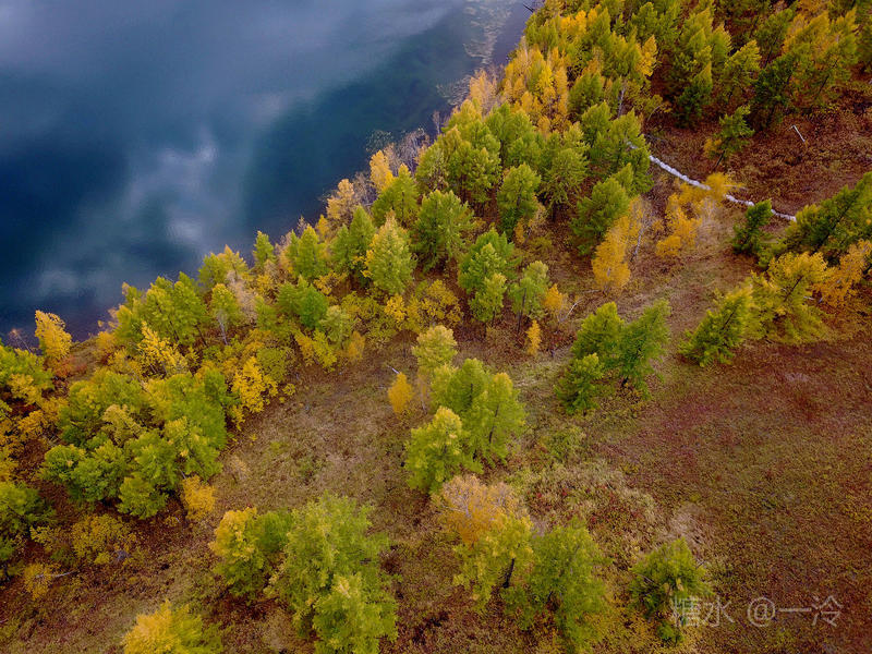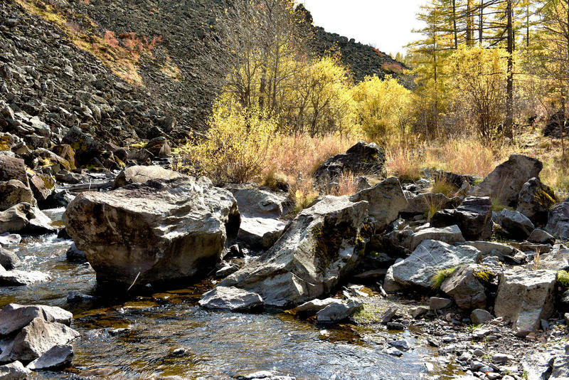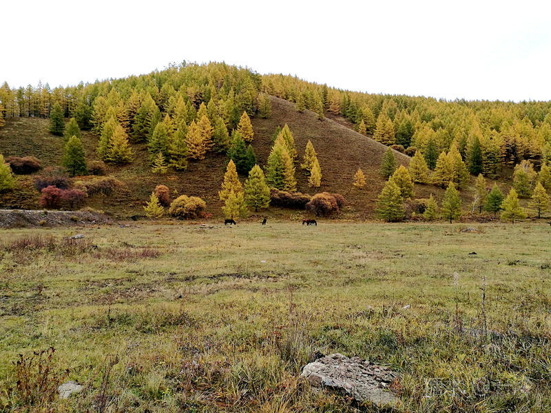 玄黑色的峡谷石块,金黄色的落叶松白桦树,犹如一幅斑斓多彩的油画。