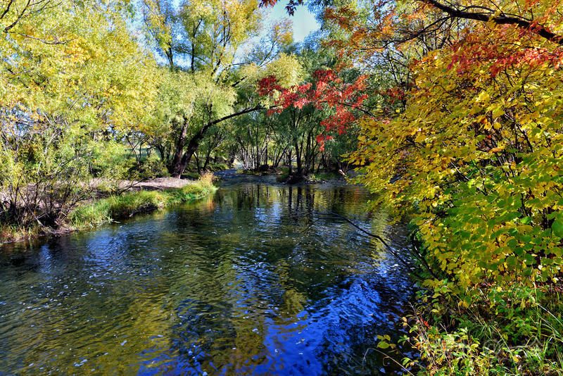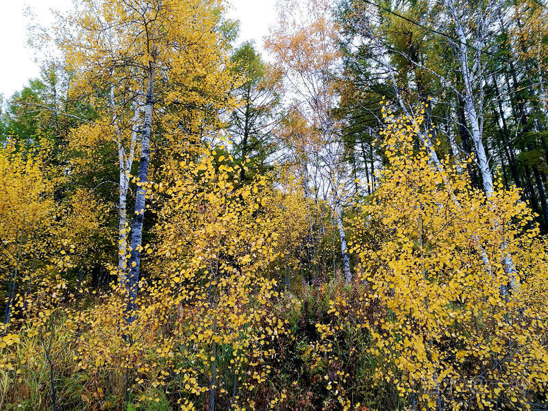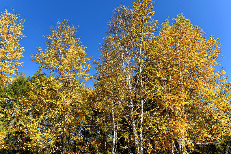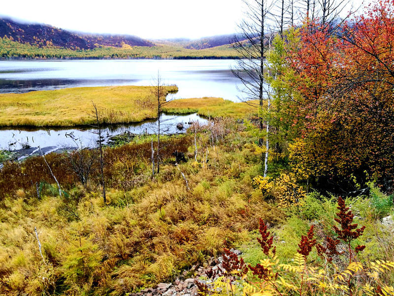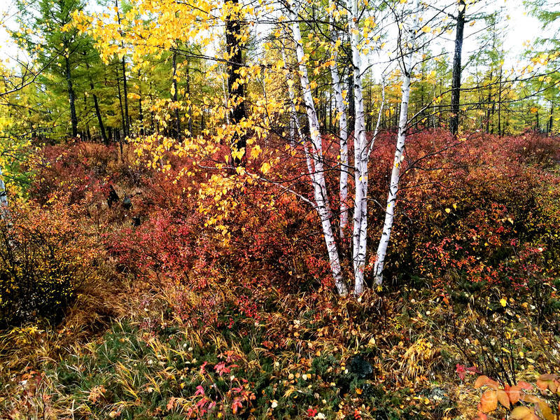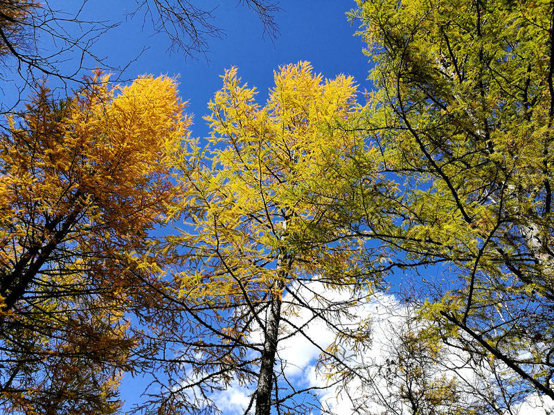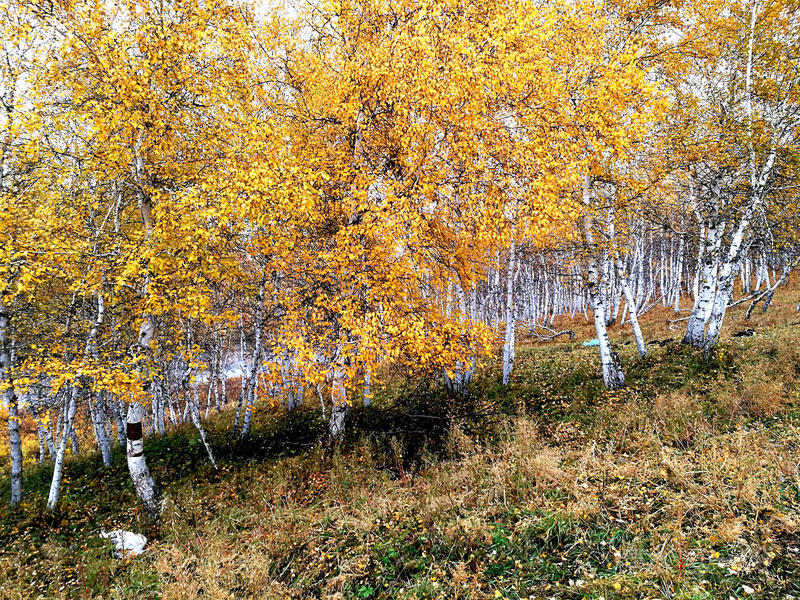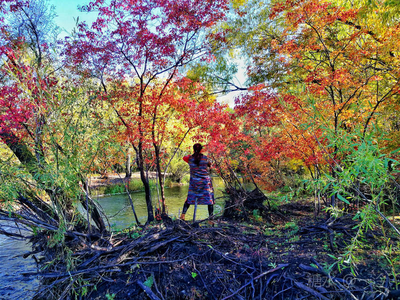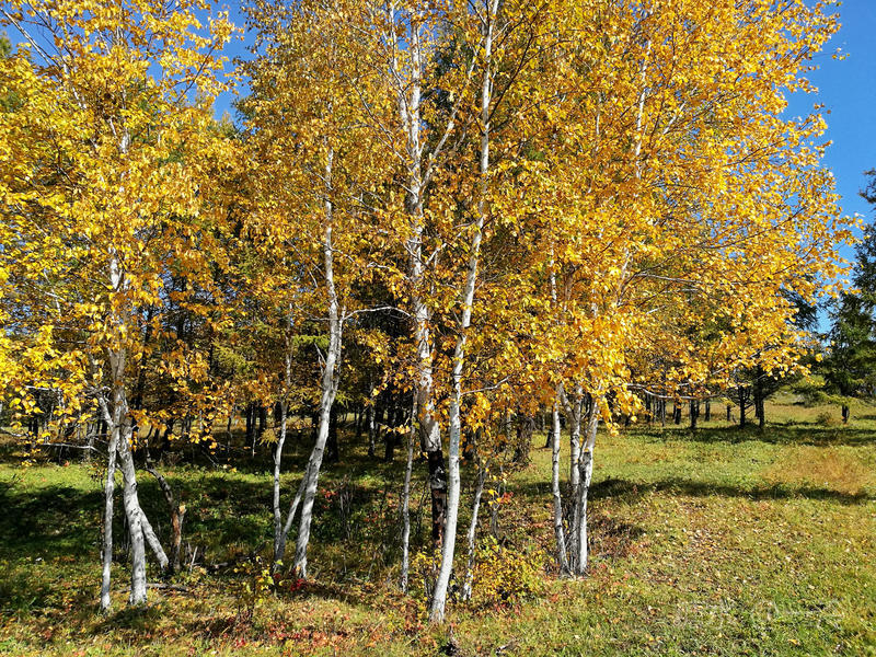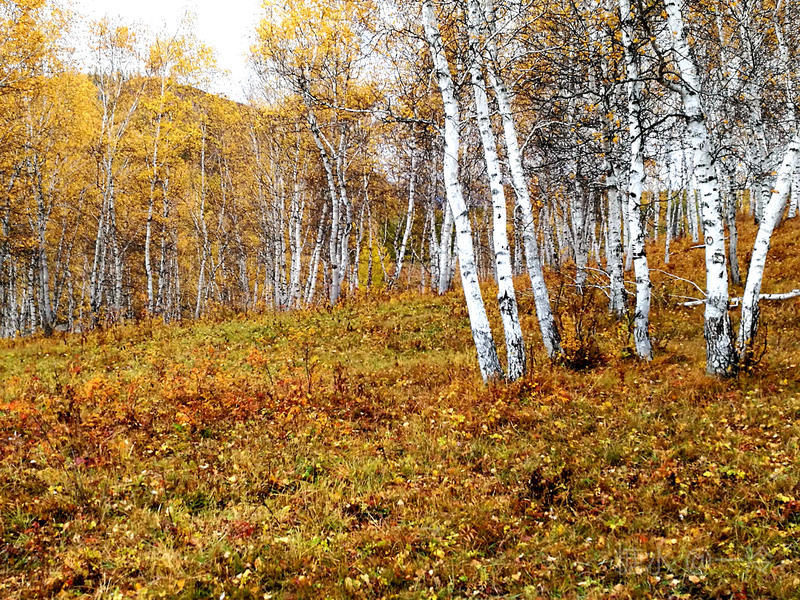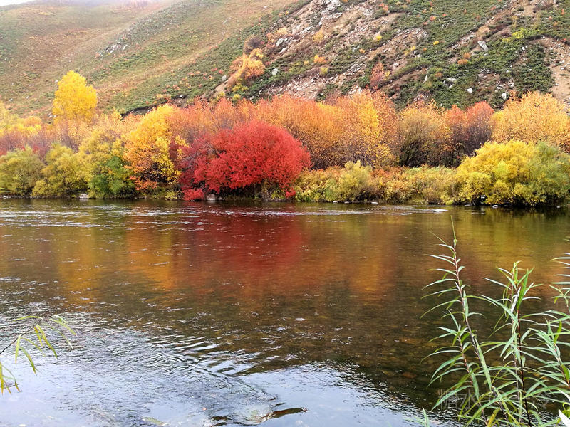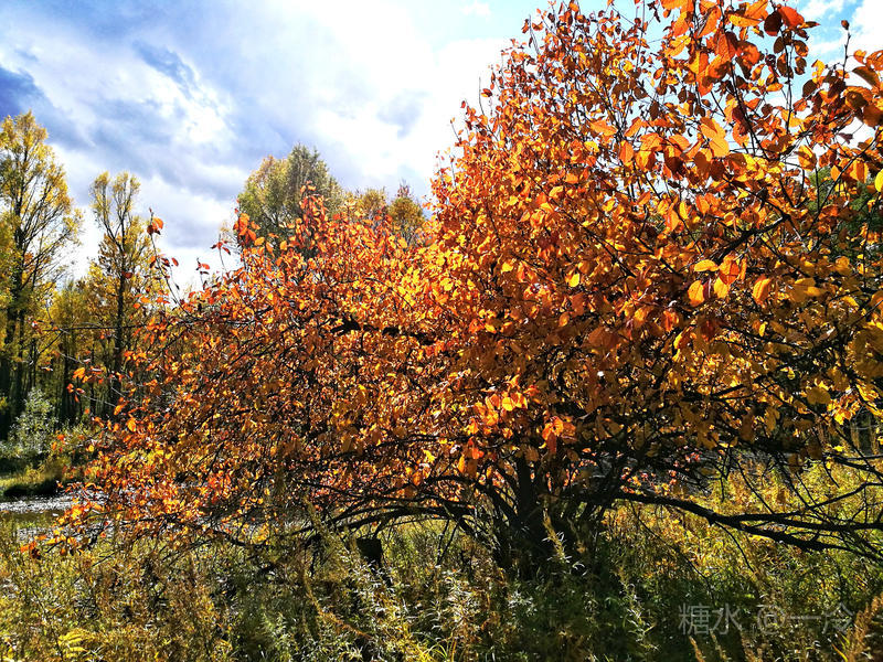 玄黑色的峡谷石块,金黄色的落叶松白桦树,犹如一幅斑斓多彩的油画。