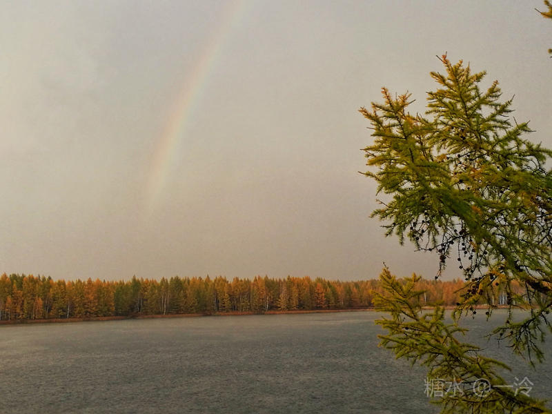 傍晚时分风雨稍歇,湖面上出现一道彩虹。
