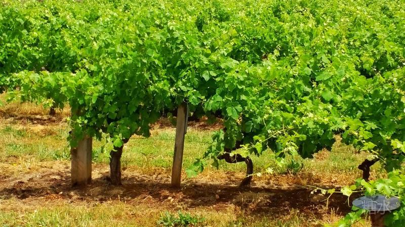 路左边是成熟的葡萄园,粗大的葡萄藤曲折着缠绕着架子展开着宽大的绿叶,盎然喷薄着生机。 路边有牌子表示不能向前进入葡萄园内,怕由人带入细菌影响葡萄生长。