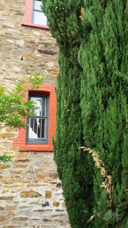建筑物都是大红的窗沿,墨绿的门,屋檐很浅,门是各式的,有长条形,有方形的,有椭圆形的,用途不明,也许是生产酒的需要。 我穿着同样红色的上衣,坐在那里。