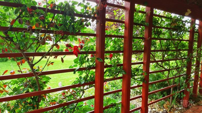 我站在葛兰许小屋三角形花棚下往外看。