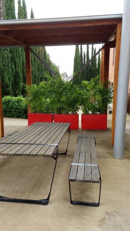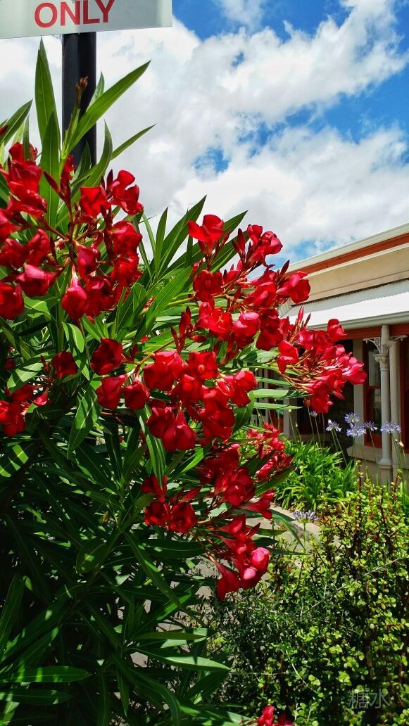 有装饰性的酒桶在平台上排列,二边绿的草坪的树上绽满了红粉色的花朵。细长的花和叶一株株的展开来,形似喷泉,实在太美了。