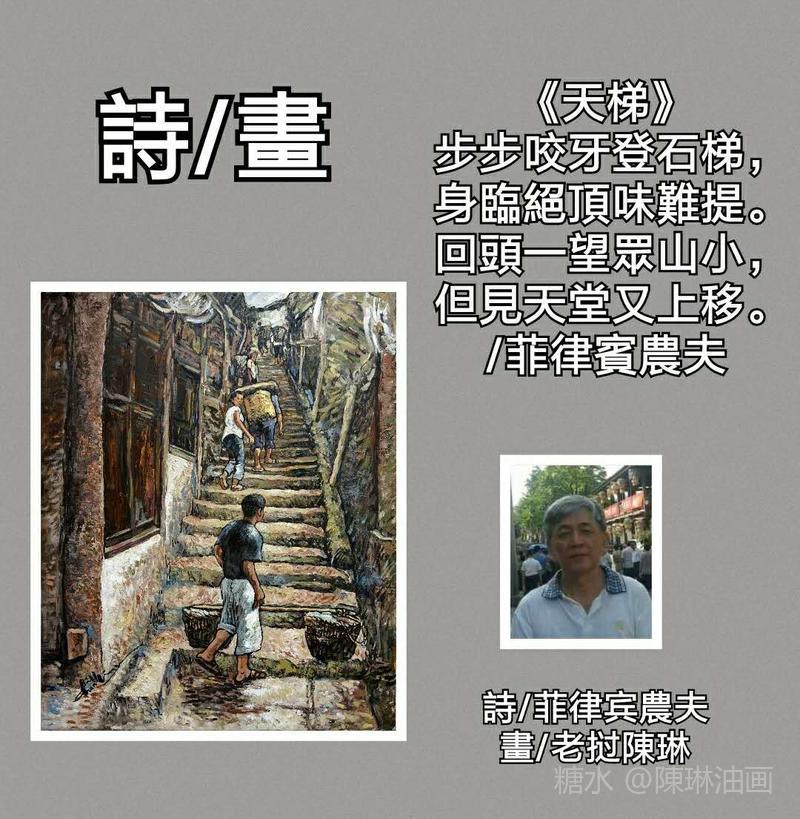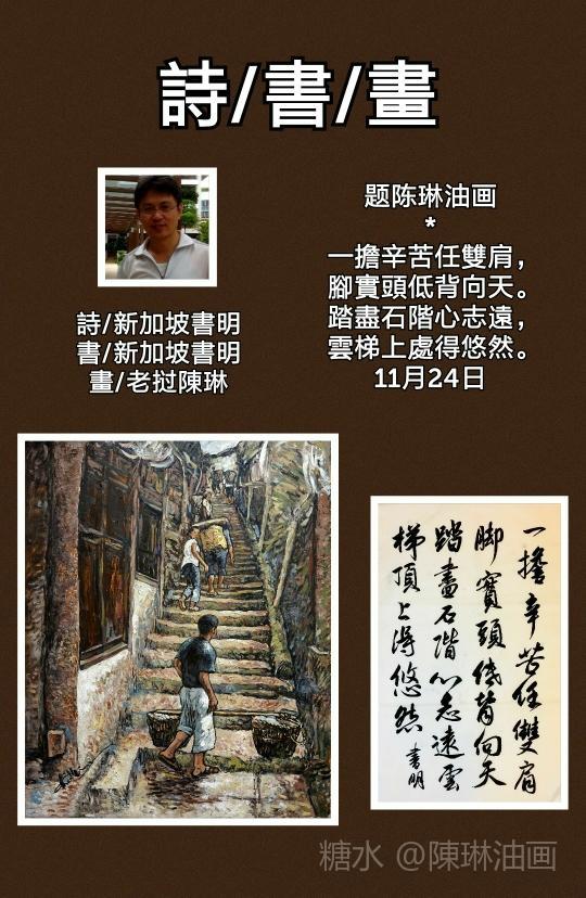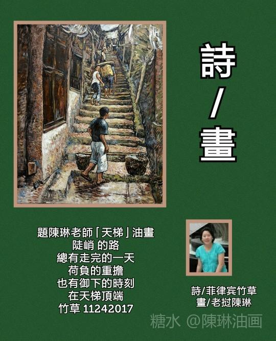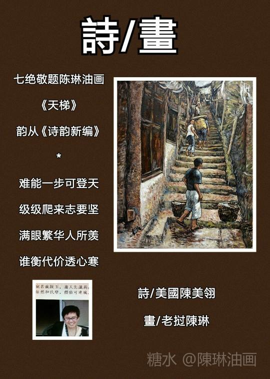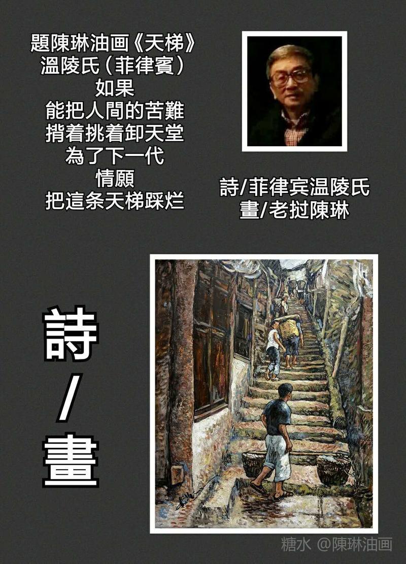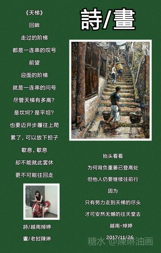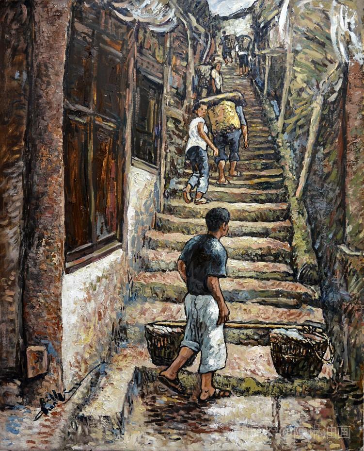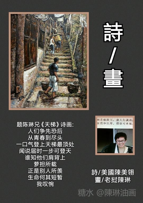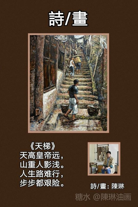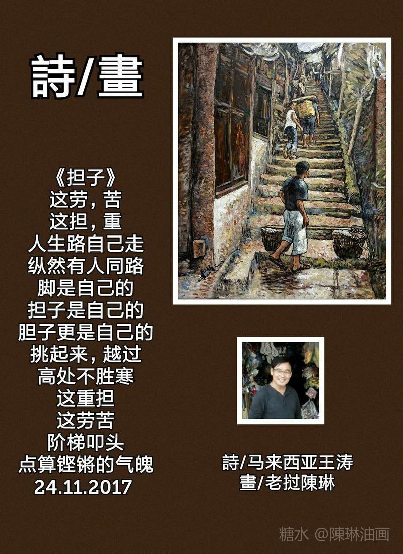 读陈琳老师油画有感: 虽然我们现在生活在城市,不需要再像以前那样肩担背扛,但生活担子并没有减轻。从观画之背担登梯,可大见生活之理。挑夫心在梯,则担重,心在顶,则担轻。成功者应脚踏实地,俯首攀登,拾阶而上,渐行渐高,功到自然成。 /书明/