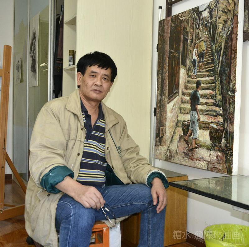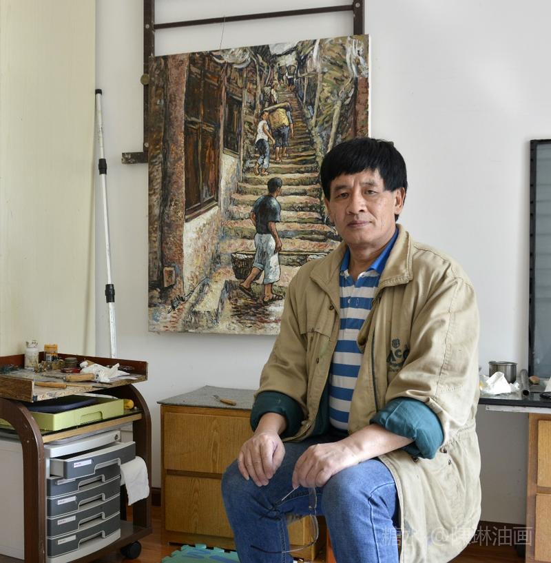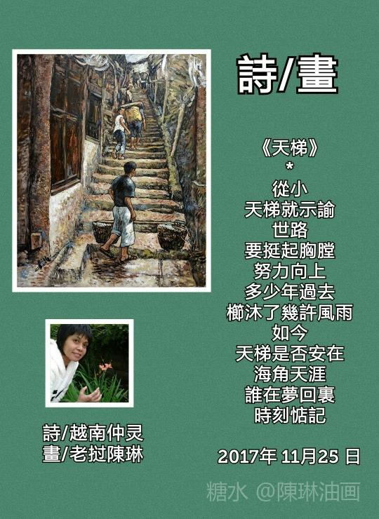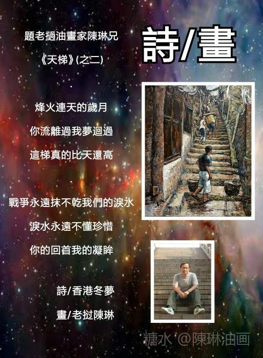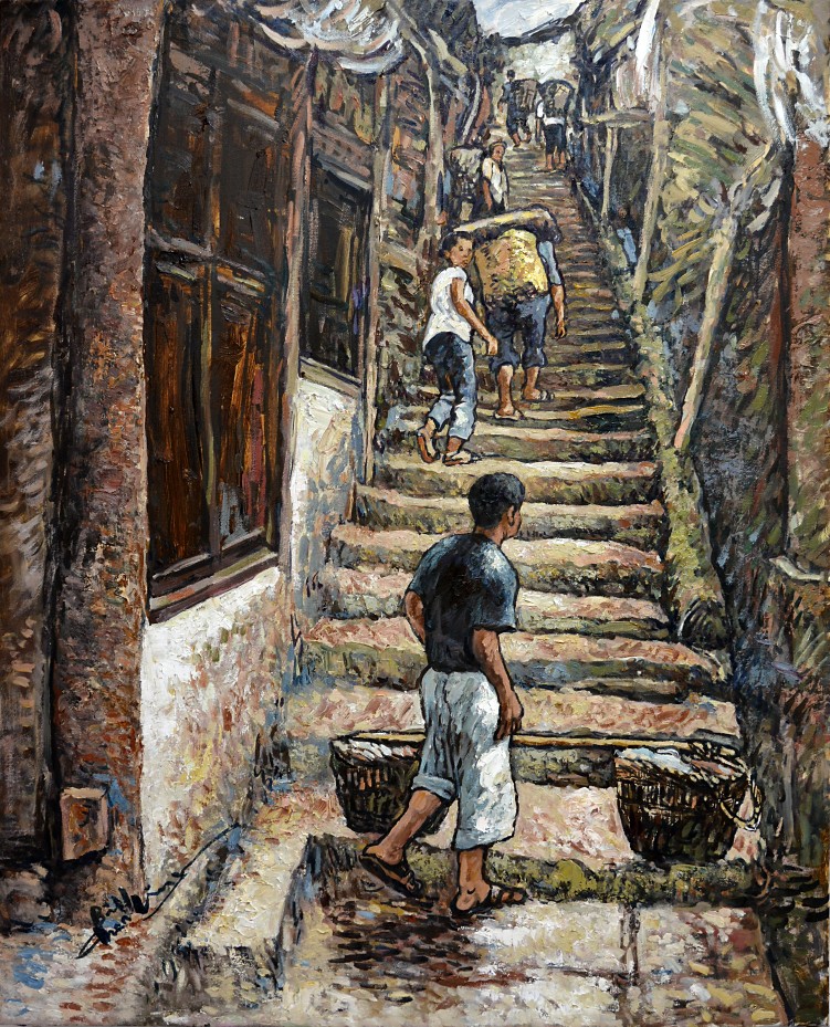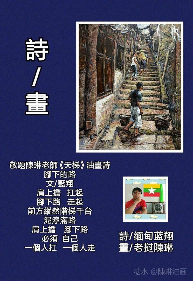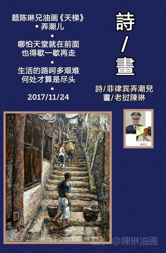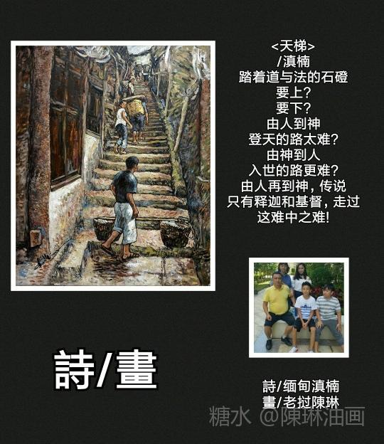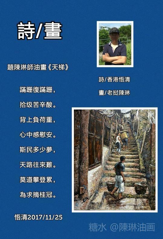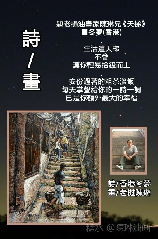 读陈琳老师油画有感: 虽然我们现在生活在城市,不需要再像以前那样肩担背扛,但生活担子并没有减轻。从观画之背担登梯,可大见生活之理。挑夫心在梯,则担重,心在顶,则担轻。成功者应脚踏实地,俯首攀登,拾阶而上,渐行渐高,功到自然成。 /书明/