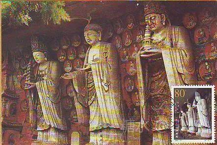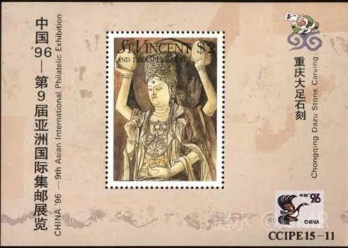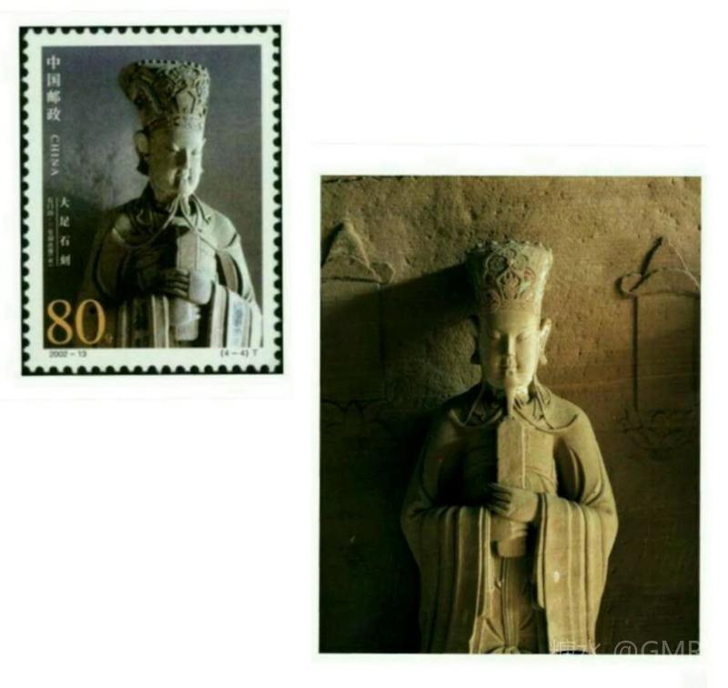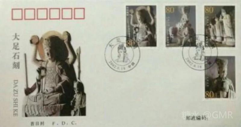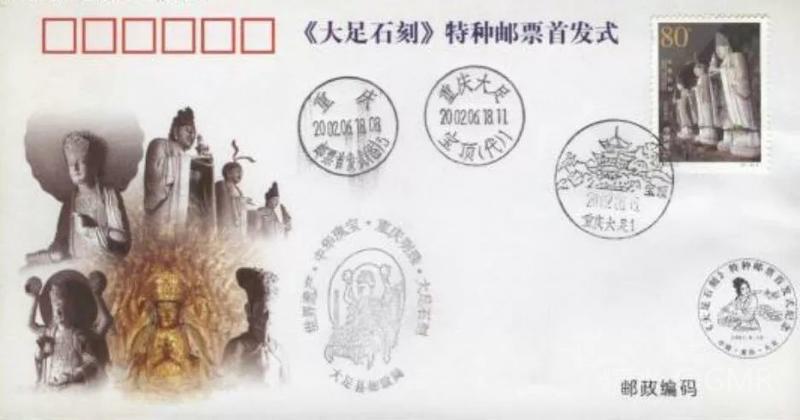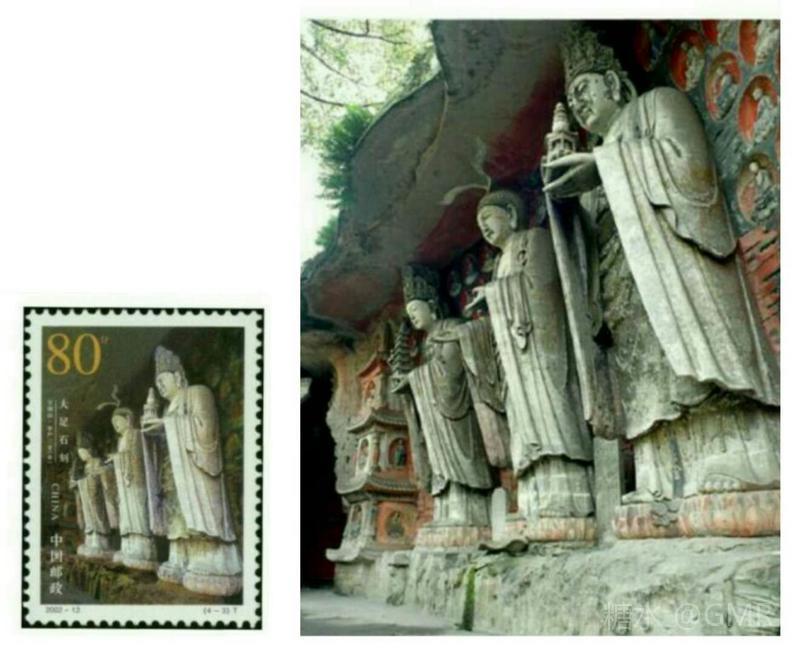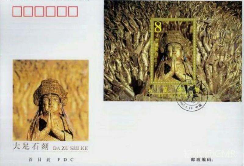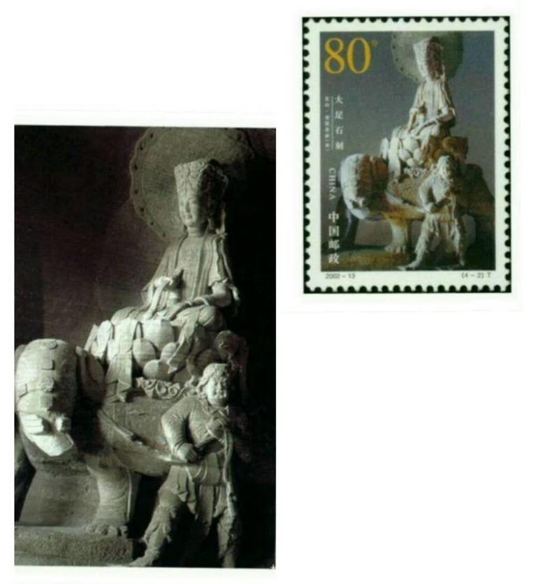 2002年6月18日,为了展示中华民族历史悠久的石刻艺术和世界文化遗产,国家邮政局发行了《大足石刻》特种邮票,全套4枚;小型张1枚 本套邮票和小型张图案均选取宋代石刻造像,人物神情慈婉,风度优雅,为大足石刻的代表之作