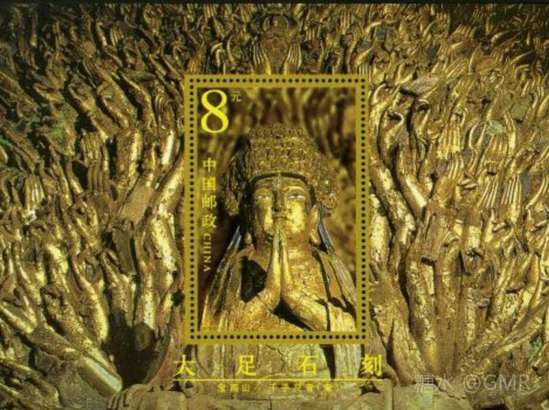 小型张为“宝顶山.千手观音”。选自宝顶山大佛湾南岩第8号龛,
