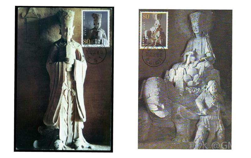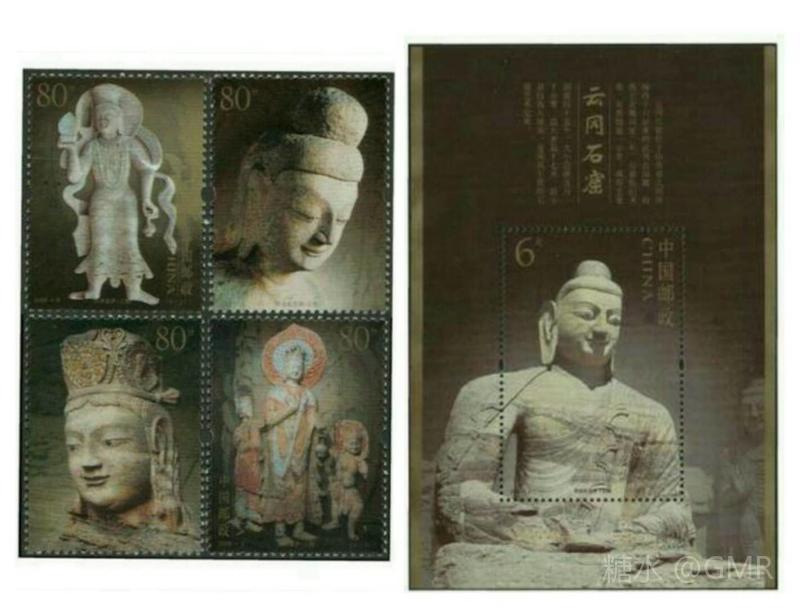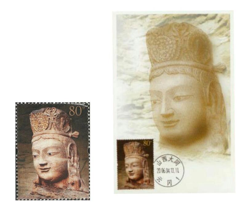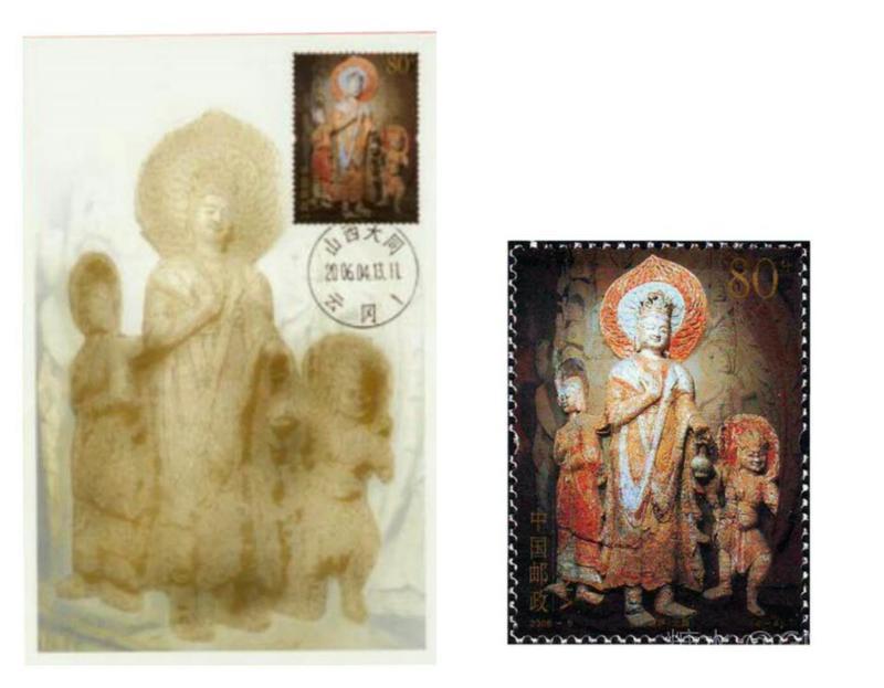 2006年4月13日,为展示中华民族历史悠久的文化艺术和世界文化遗产,国家邮政局发行了《云冈石窟》特种邮票,全套4枚;小型张1枚 本套邮票依据摄影照片设计。通过光感的强调很好地突出了主体,背景的淡化处理和暗色调的营造衬托出独特的神秘与深邃感,无边框的构图更是展现了石窟造像的大气之美