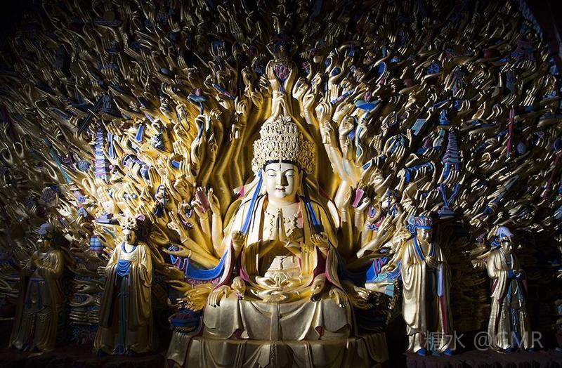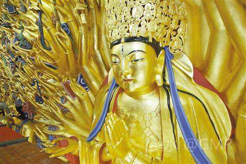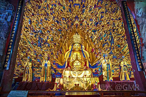 (4-1)《北山.日月观音》选自大足北山佛湾136号“转轮经藏窟”内右壁正中 观音身有六臂,其上两臂分托日、月;后两臂各握斧、剑;下两臂分别作捧钵、持柳状