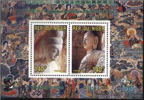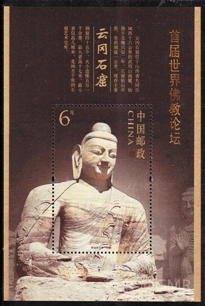 小型张为“释迦牟尼佛”。画面取自第20窟,为该窟主佛。由于窟顶崩圮,成为露天造像。佛高14米,造像雄浑,气魄宏伟,为云冈石窟的代表作品