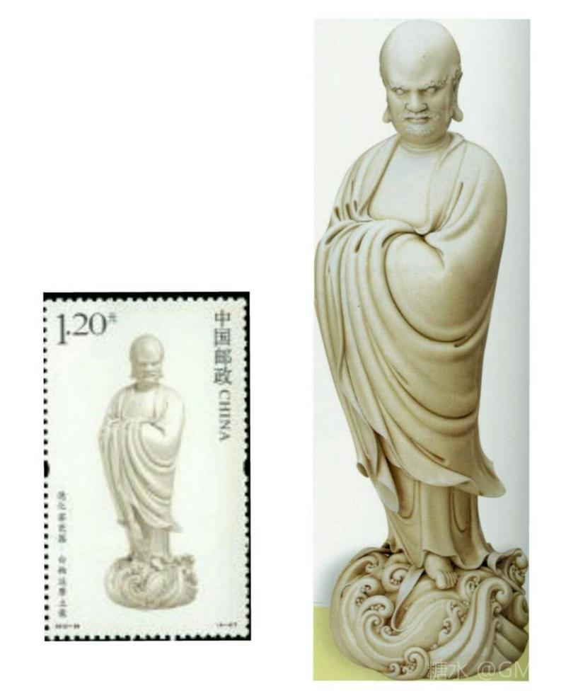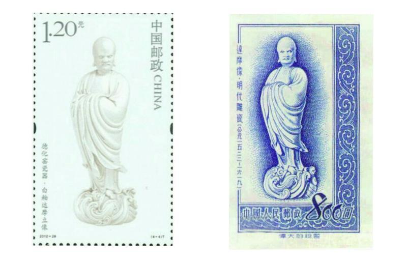 珍藏在北京故宫院的这座“达摩立像“在全世界所有达摩类的瓷塑中被公认为最好的,1951年国家邮电部曾将此立像列入特9《伟大祖国——古代文物》邮票发行计划。见上图(右)为当时的邮票设计图纸