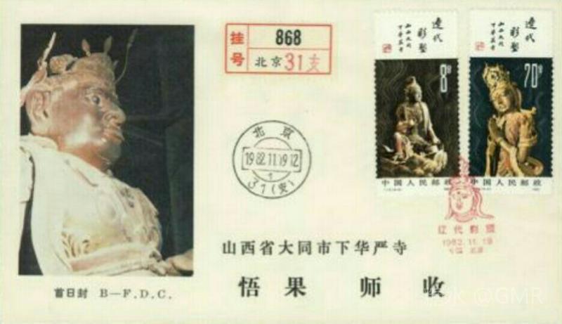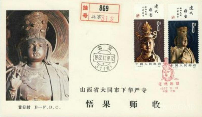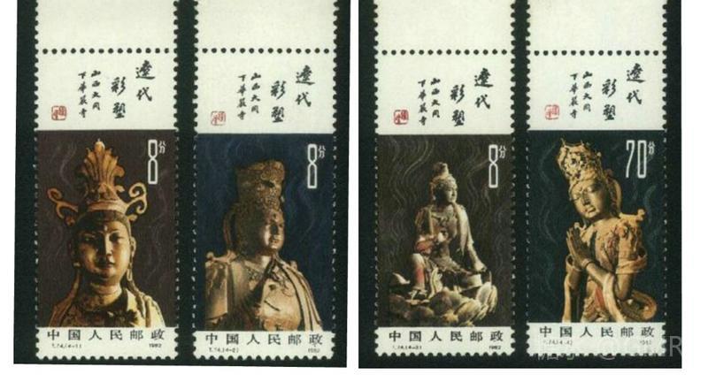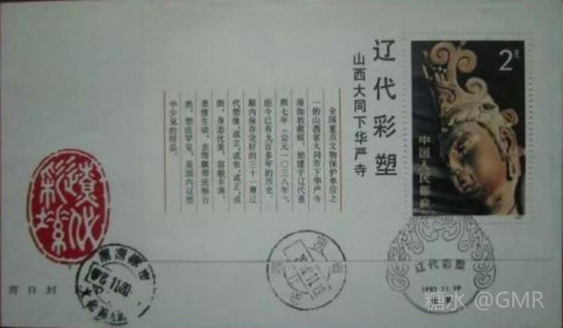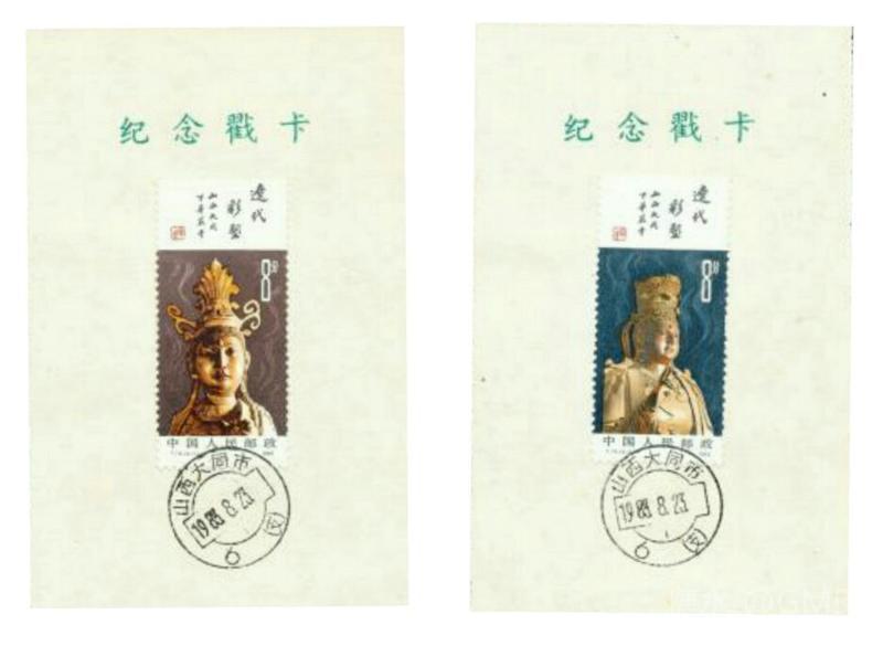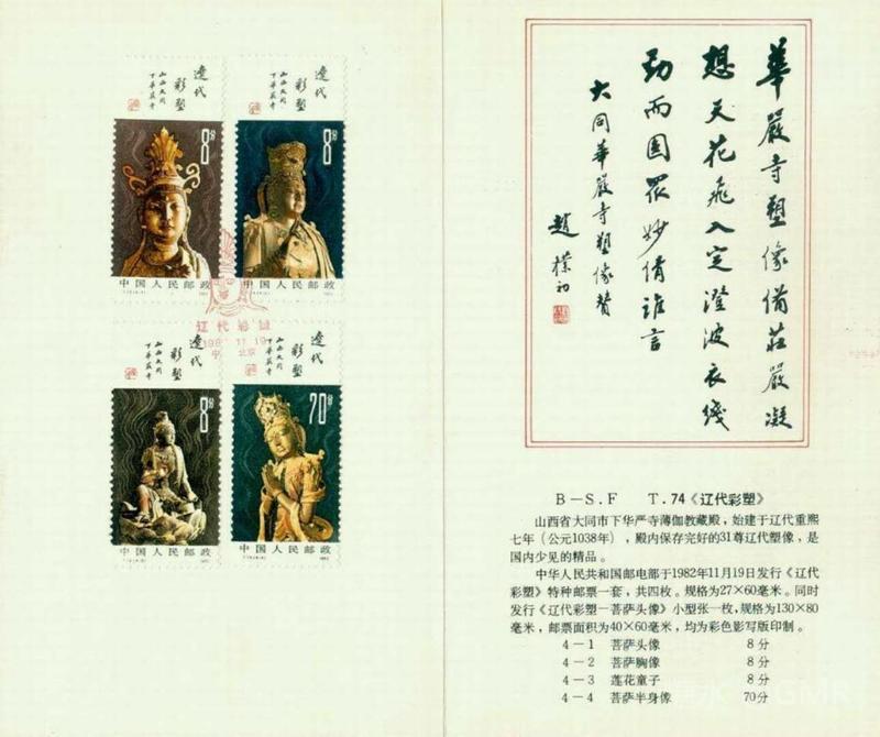 1982年11月19日,为了反映中华民族彩塑艺术的悠久历史,邮电部发行了《辽代彩塑》特种邮票,全套4枚;小型张1枚 这套邮票图案采用了山西大同下华严寺的一组金色辽代彩塑菩萨像,在棕褐和棕红色衬托下,造型优美,容貌丰满,表情生动,衣饰流畅自然。画面以深色衬底,特别是几缕缭绕的香烟,更加渲染了菩萨的神秘色彩。画面上方留出的空白篇幅,安排了赵朴初的亲笔题字:“辽代彩塑”“山西大同下华严寺”,并缀以一方“辽塑”朱色篆刻,恰到好处地点明了主题