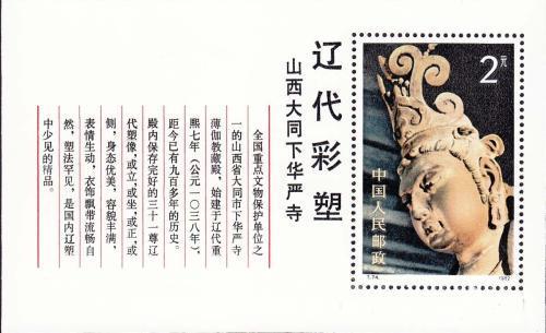 小型张邮票主体画面为辽代彩塑中的菩萨头像,造型优美,神态生动。左侧文字是山西大同市华严寺的简介
