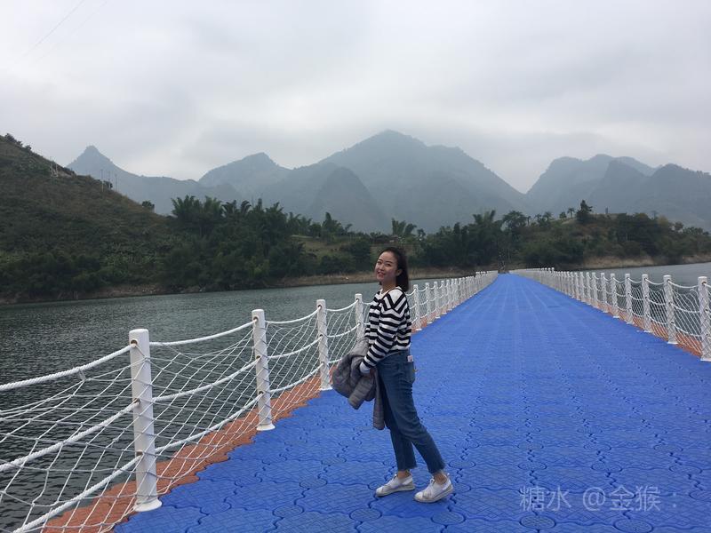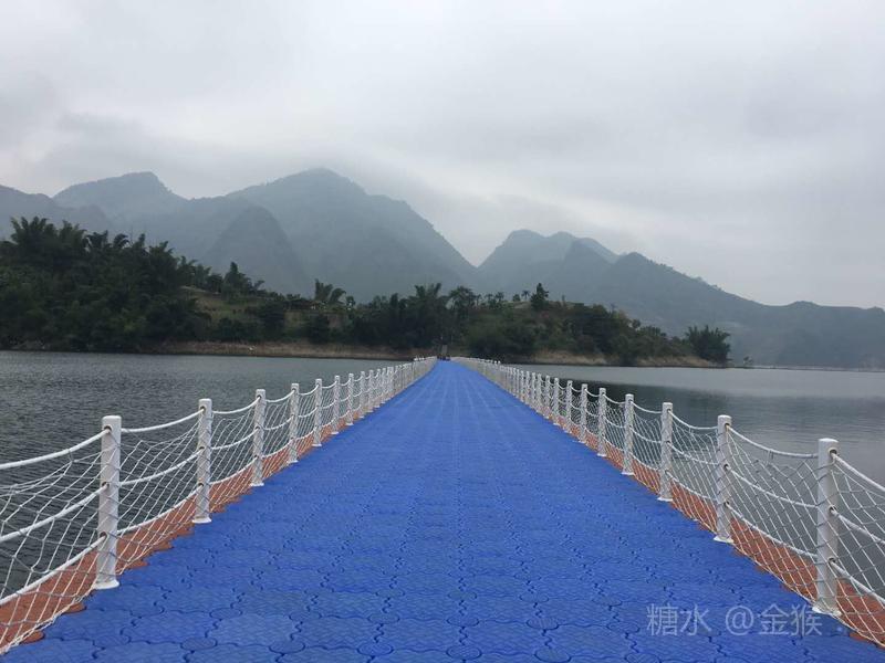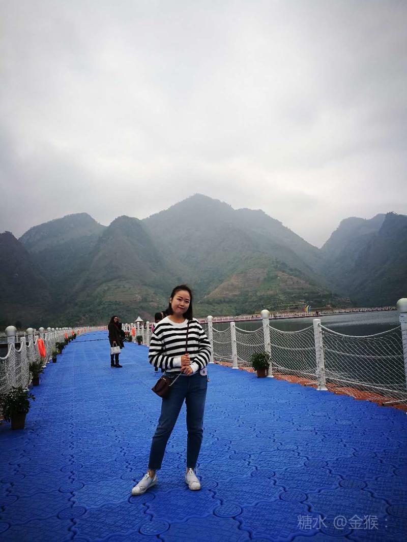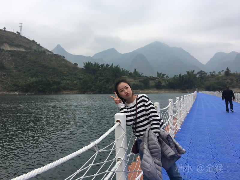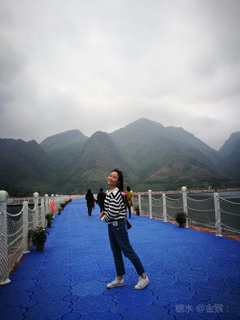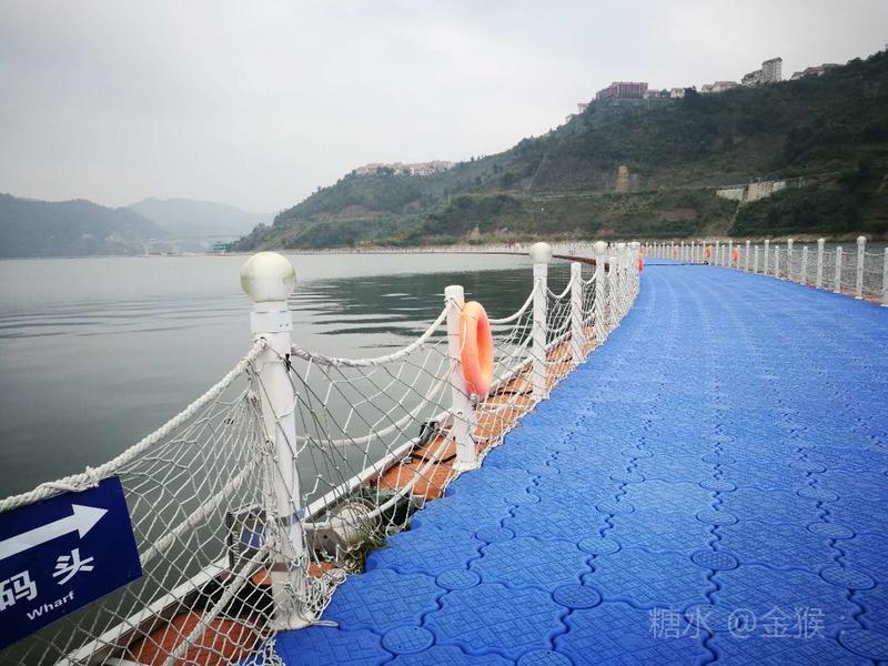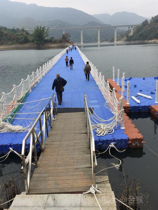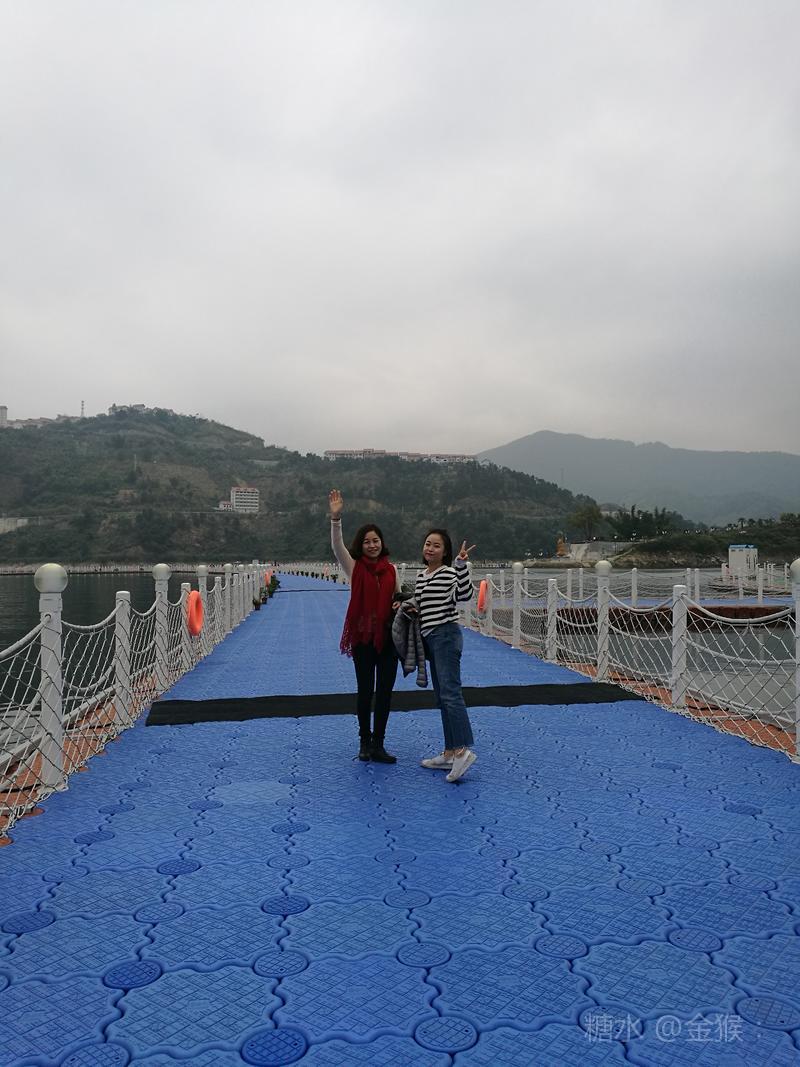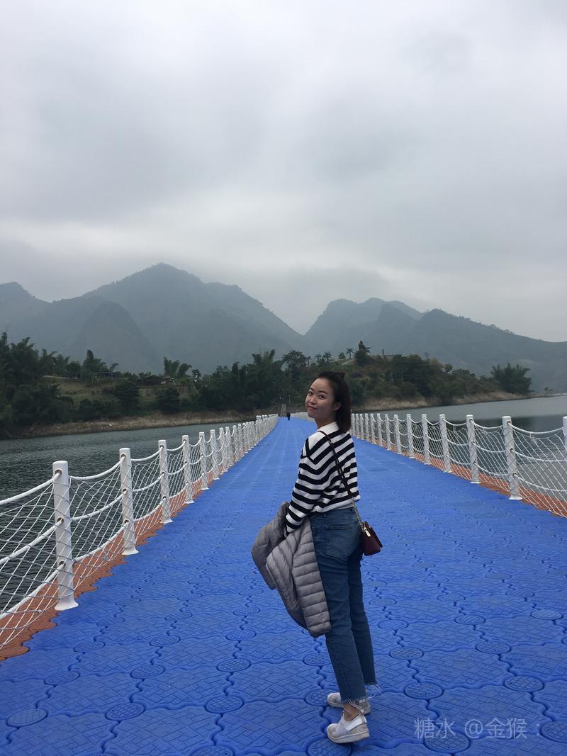 我们边走边看,走到湖面水上栈道上来啦😊 !宽阔的湖面,淡蓝色的水上栈道,好美哦!我们眺望四周群山环水,拍照,漫步灬