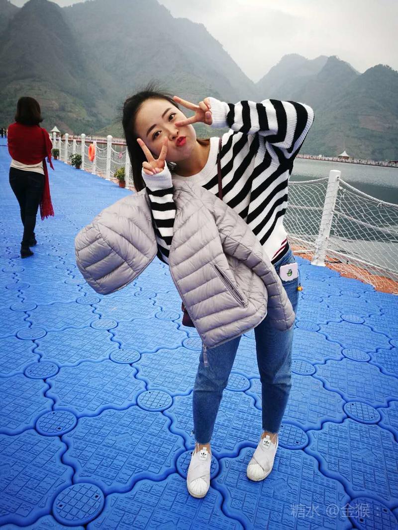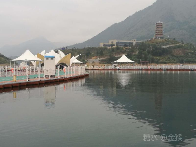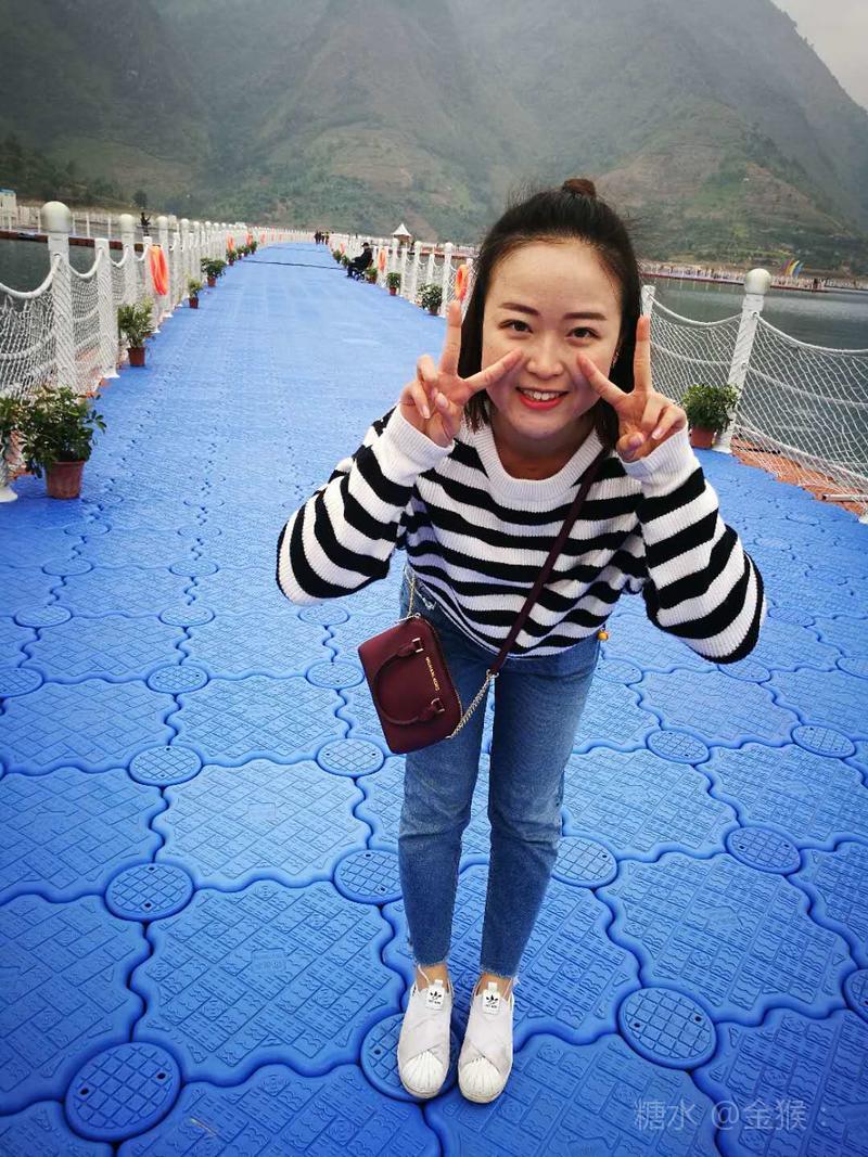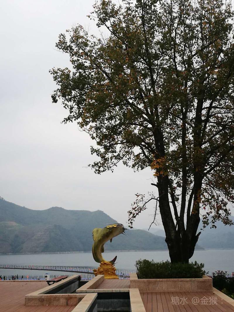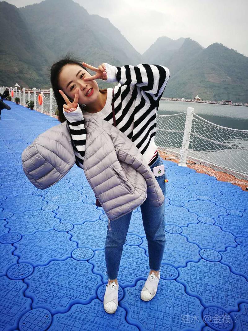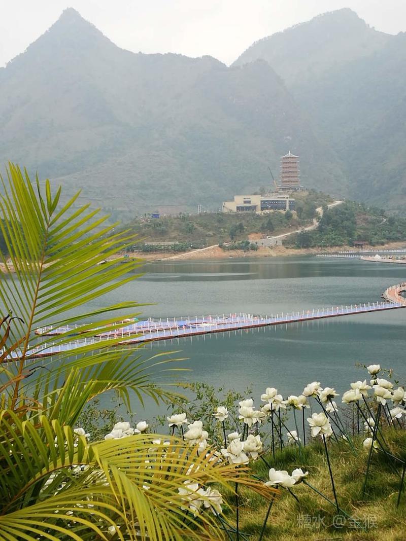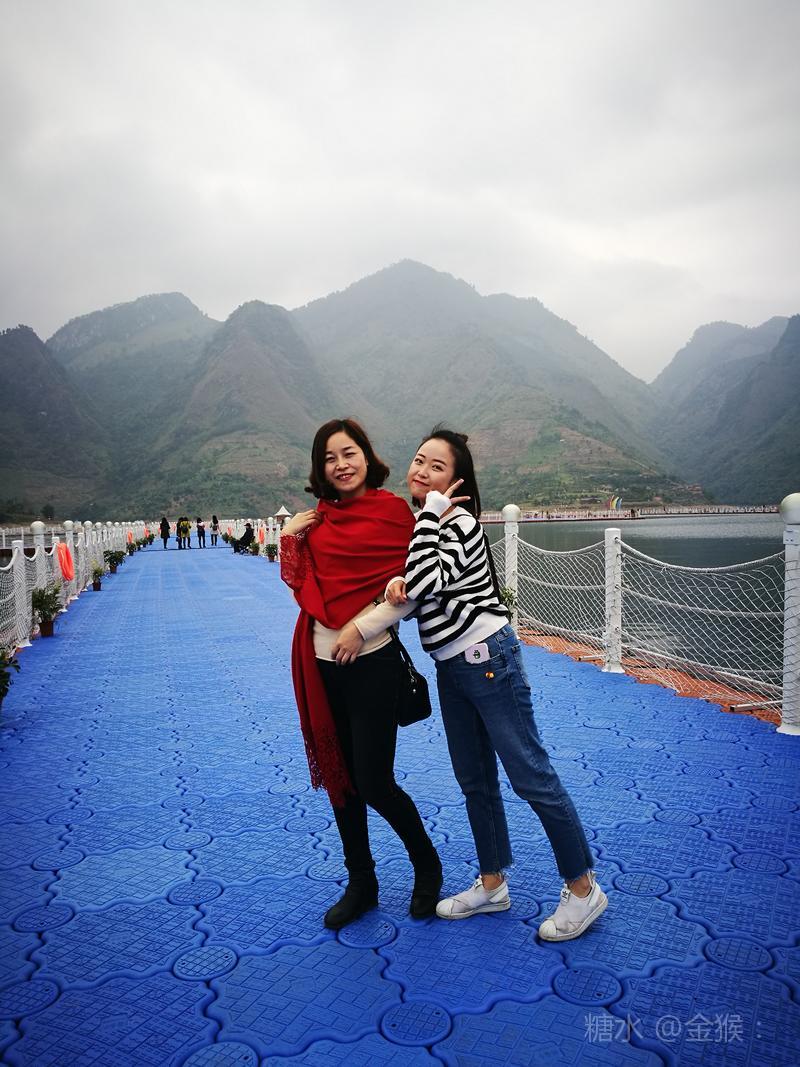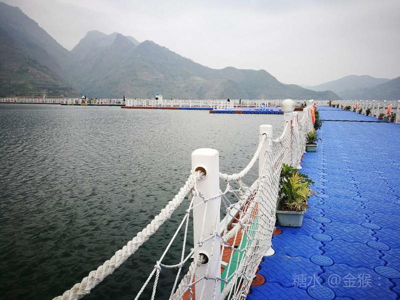 我们边走边看,走到湖面水上栈道上来啦😊 !宽阔的湖面,淡蓝色的水上栈道,好美哦!我们眺望四周群山环水,拍照,漫步灬
